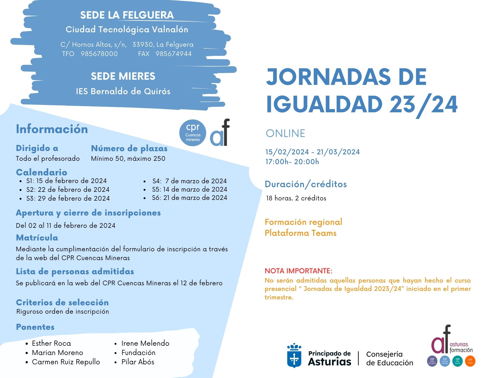 No serán admitidas aquellas personas que hayan hecho el curso presencial “ Jornadas de Igualdad 2023/24” iniciado en el primer trimestre.