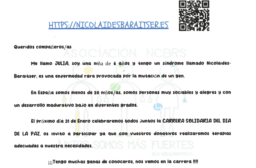 Este curso correremos para la Asociación Síndrome Nicolaides Baraitser. Las donaciones voluntarias que se recauden, irán destinadas a dicha asociación, que fue creada en 2015, teniendo muy pocos componentes debido a que el número de casos en todo el Mundo es muy pequeño, 12 casos en toda España y uno de ellos en Oviedo, por lo que necesitan toda la ayuda que les podamos dar.