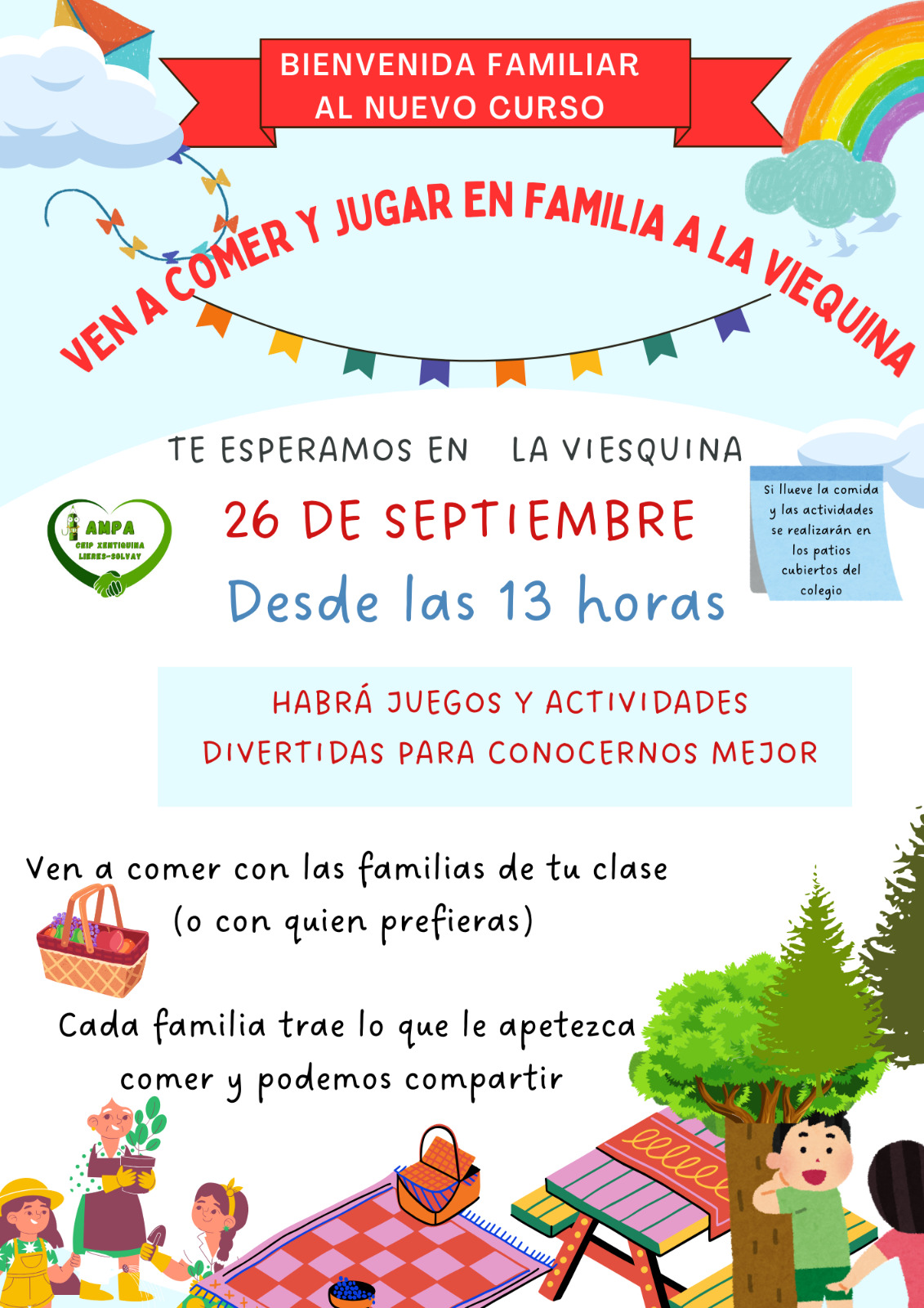 El próximo viernes 26 de septiembre os proponemos venir a comer a La Viesquina con las familias de clase, habrá juegos para grandes y peques, para conocernos mejor.
