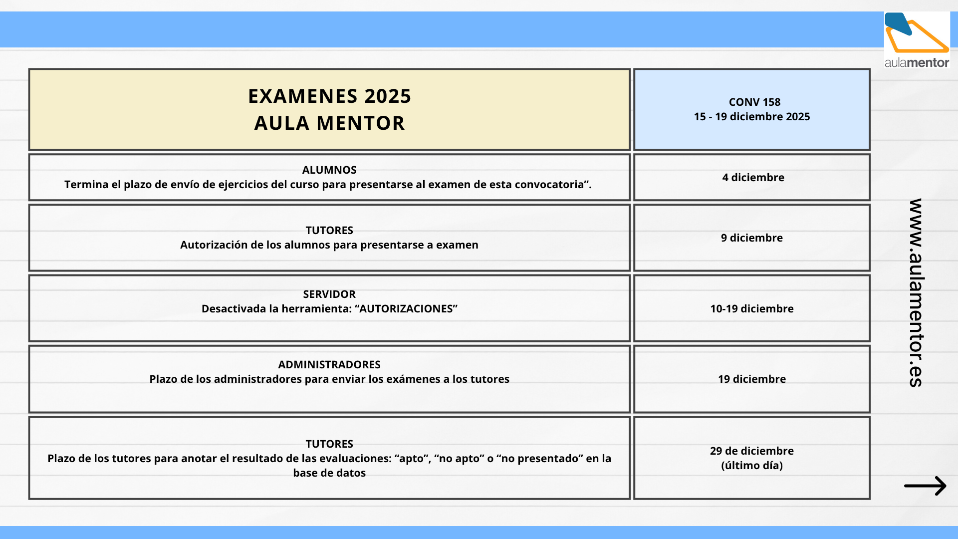 Ya se publicó el calendario de exámenes del Aula Mentor para la convocatoria de diciembre de 2025