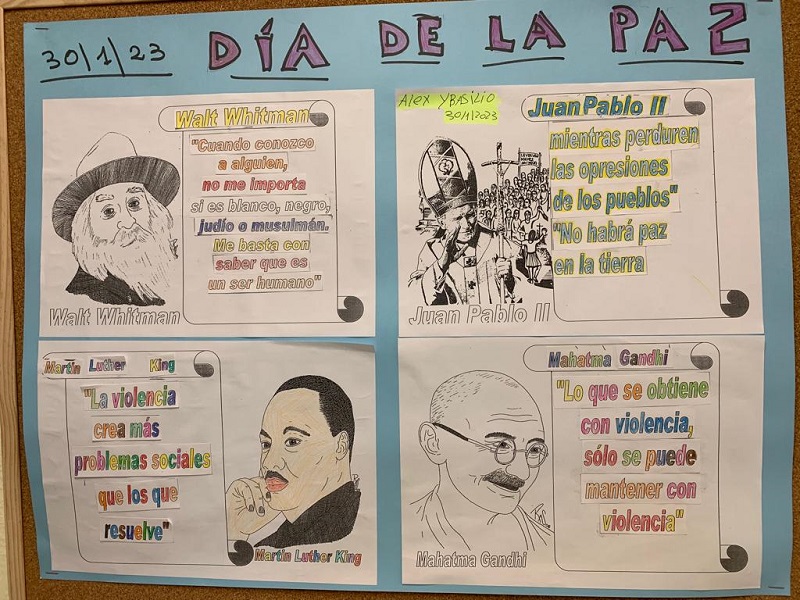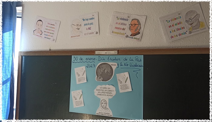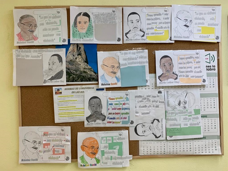 Introducimos esta actividad recordando al alumnado que este día escolar de la Paz y no violencia coincide con la muerte de Mahatma Gandhi. Seguidamente hemos trabajado la biografía de Malal Yousafzai, como eje vertebrador de la actividad complementándolo con la visualización del vídeo de su discurso al recoger el Premio Nobel de la Paz. También se han trabajado distintas citas de personajes célebres (Walt Whitman, Martin L. King, Indira Gandhi, …) presentándolas al alumnado a modo de puzle (el busto de cada personaje, con su cita correspondiente). Finalmente, se elabora un mural de aula complementándolo con distintas localizaciones sobre el globo terráqueo y mapamundi en relación a los personajes trabajados.