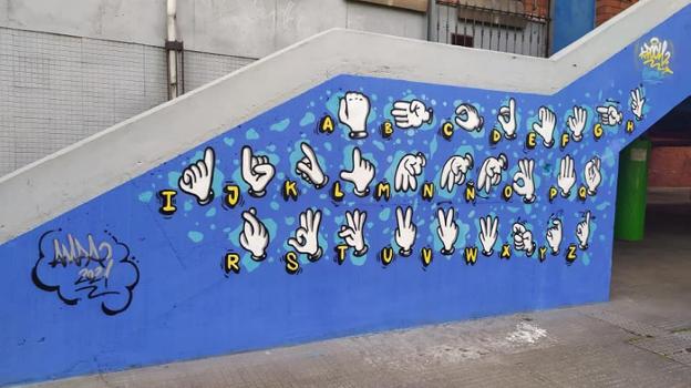 El artista corverano José 'Poch' ilustró hace unos días una de las escaleras del colegio público Francisco Fernández González de Cancienes con un mural basado en el abecedario de la lengua de signos.