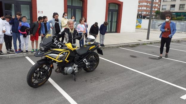 Alumnos del colegio de Cancienes se reunieron ayer en La Lechera con la viajera Sonia Barbosa durante la clausura de la muestra fotográfica con imágenes de sus viajes en motocicleta.