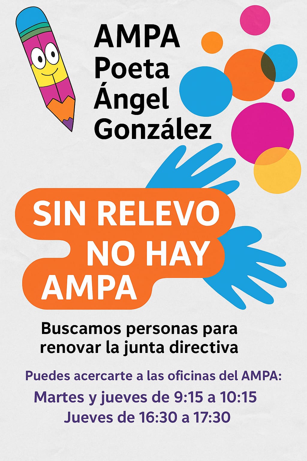 Se necesitan padres y madres con ganas y disponibilidad que quieran colaborar en el desarrollo de las actividades que el AMPA viene realizando en el colegio. Para cualquier cuestión, estamos a vuestra disposición en la oficina del AMPA en el horario de atención al público (martes y jueves, de 9:15 a 10:15; y martes de 16:30 a 17:30).