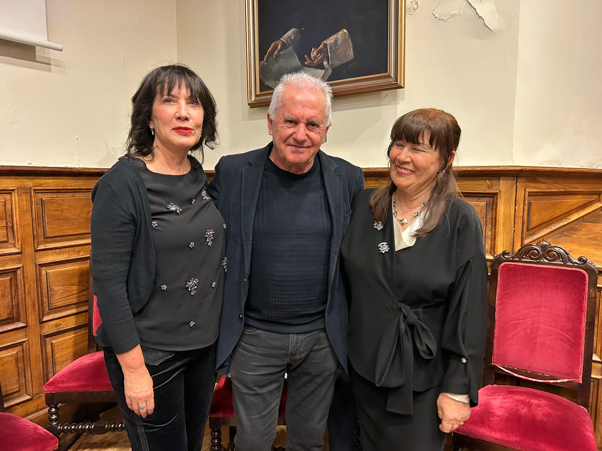 La presidenta del Consejo Escolar, María Luz Pontón, con el premiado Víctor Manuel y Esther García, presidenta de la Asociación de Escritores de Asturias