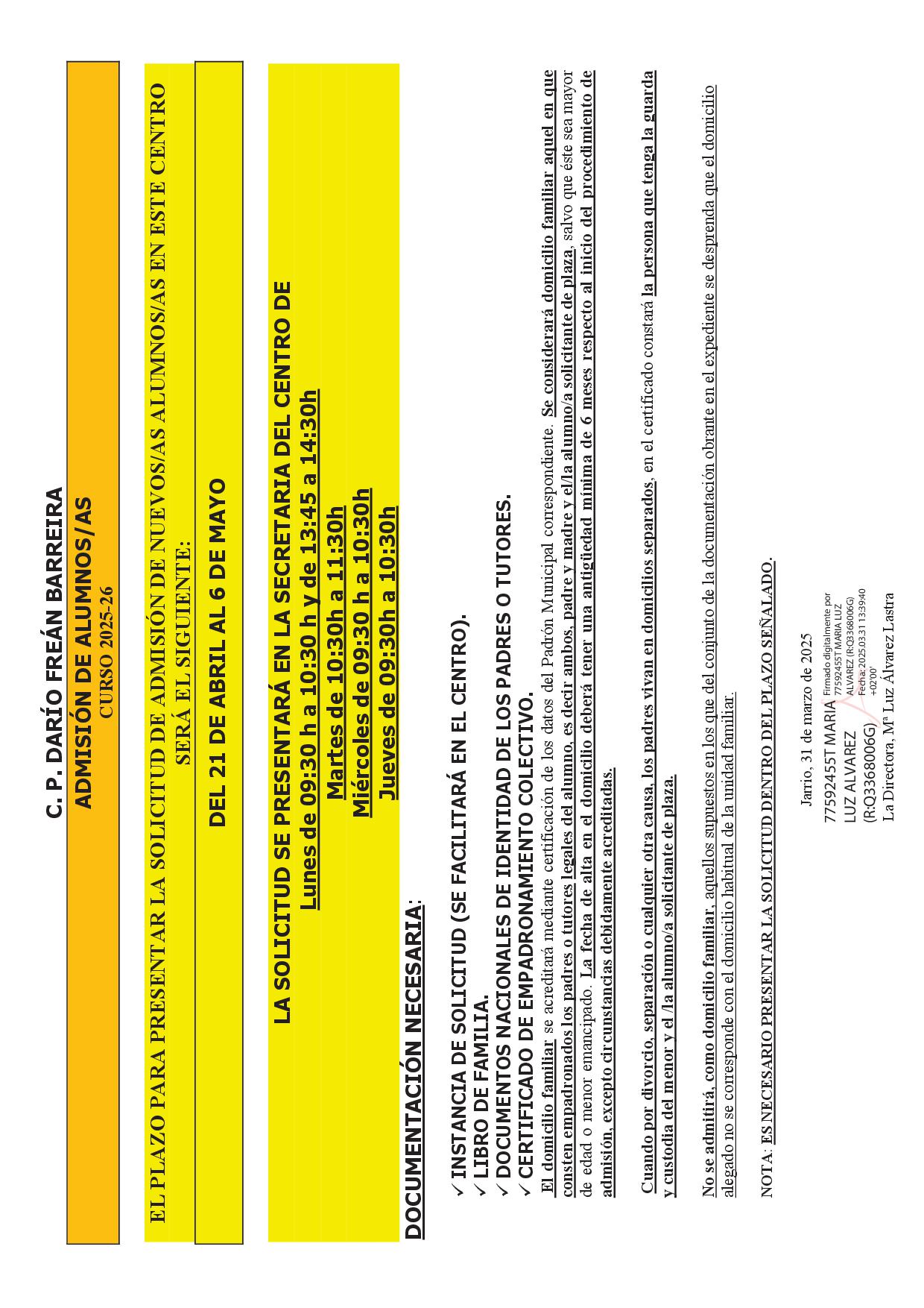 EL PLAZO PARA PRESENTAR LA SOLICITUD DE ADMISIÓN DE NUEVOS/AS ALUMNOS/AS EN ESTE CENTRO SERÁ EL SIGUIENTE: