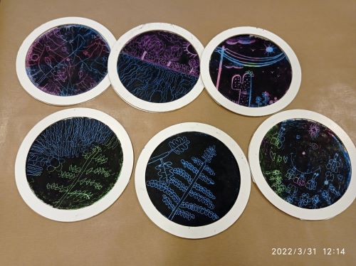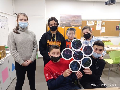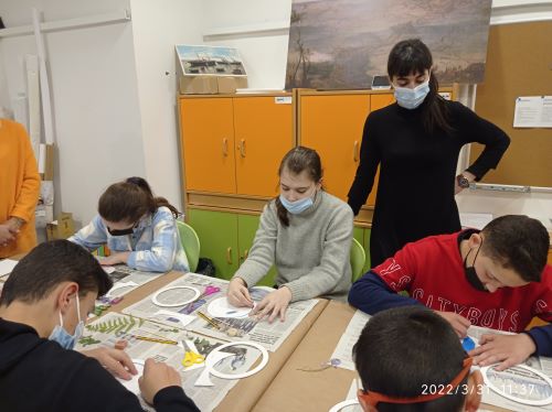 Los alumnos han tomado como punto de partida la obra de la escultora ovetense María Jesús Rodríguez, que ha hecho del cartón una de sus señas de identidad. Como en su obra, en la que investiga sobre la forma y la textura y donde el paisaje asturiano es una constante referencia, los alumnos han creado una obra conjunta, que ya adorna su aula.