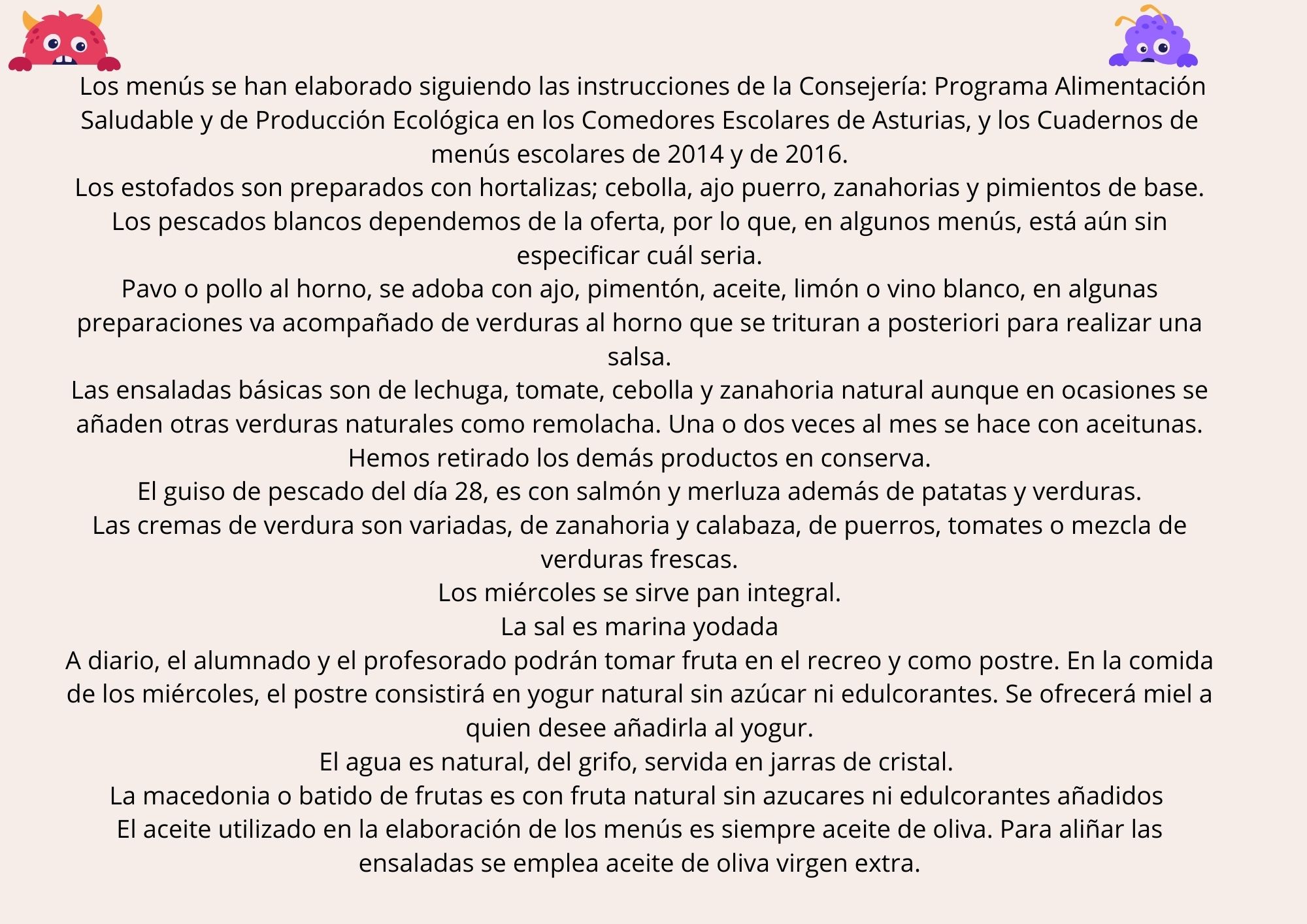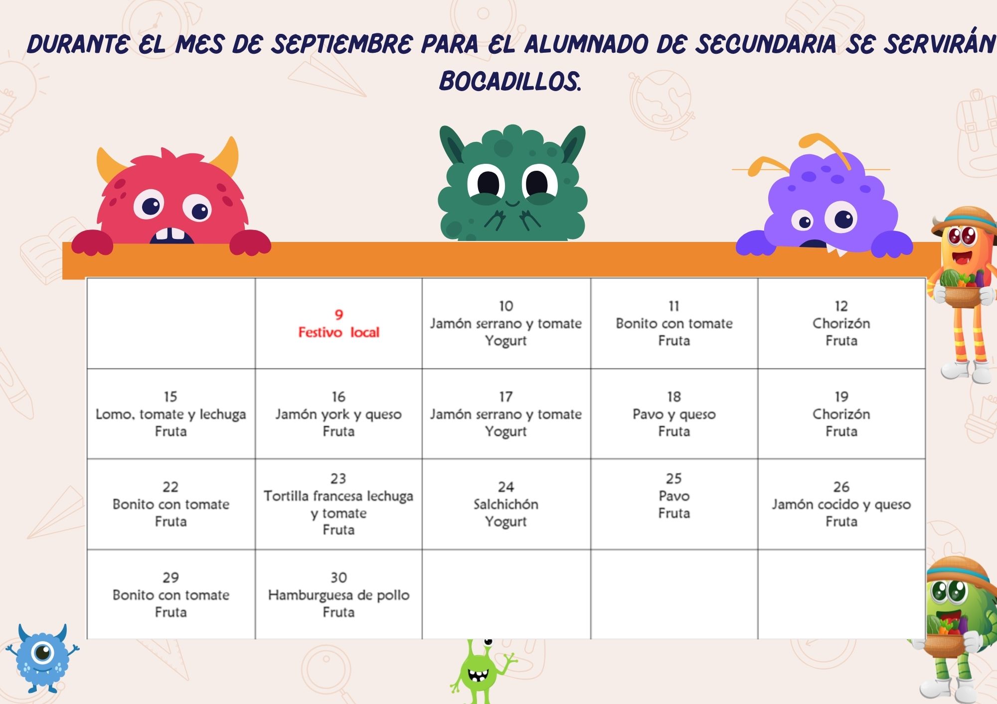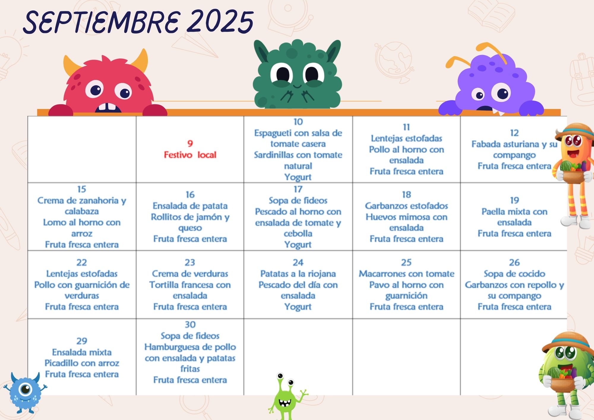 Adjunto a este mensaje encontraréis el menú del comedor escolar correspondiente al mes de septiembre, para que podáis consultar los platos que se ofrecerán cada día.