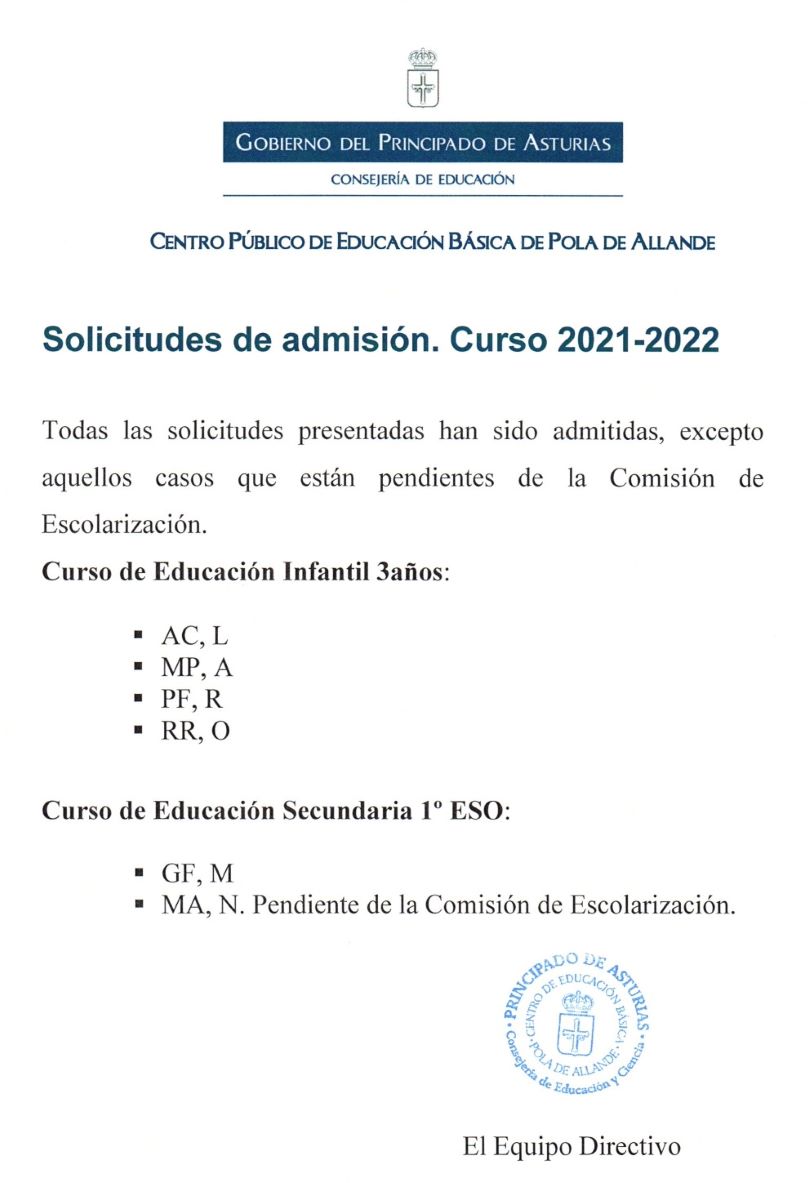 Aquí os dejamos el listado de admisión de las solicitudes presentadas para el curso 2021-2022: