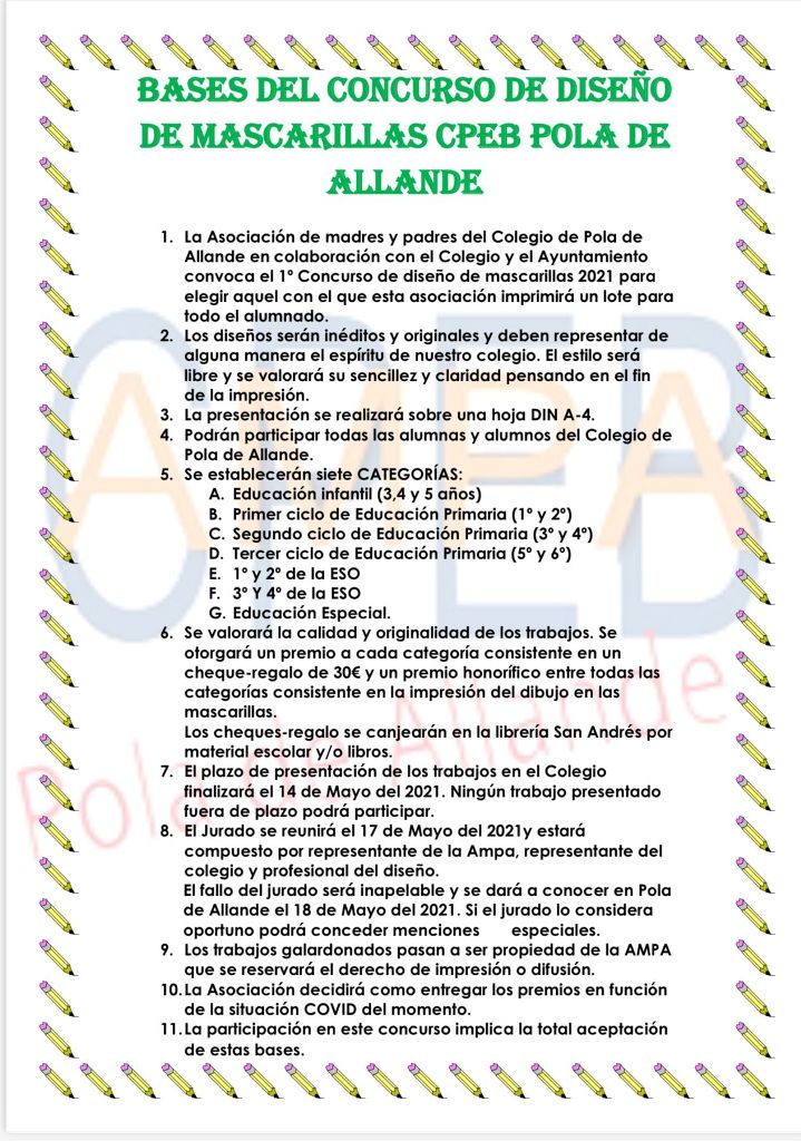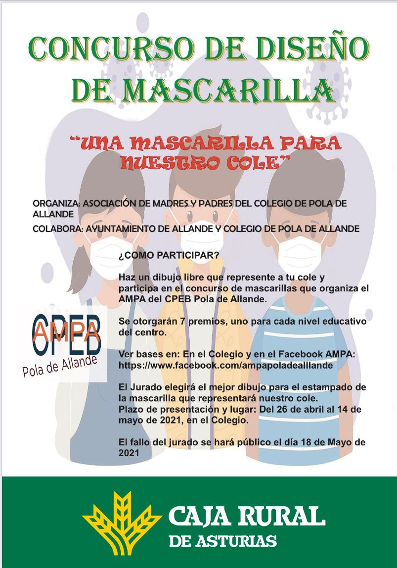 La Asociación de madres y padres del Colegio de Pola de Allande en colaboración con el Colegio y el Ayuntamiento convoca el 1º Concurso de diseño de mascarillas 2021 para elegir aquel con el que esta asociación imprimirá un lote para todo el alumnado.