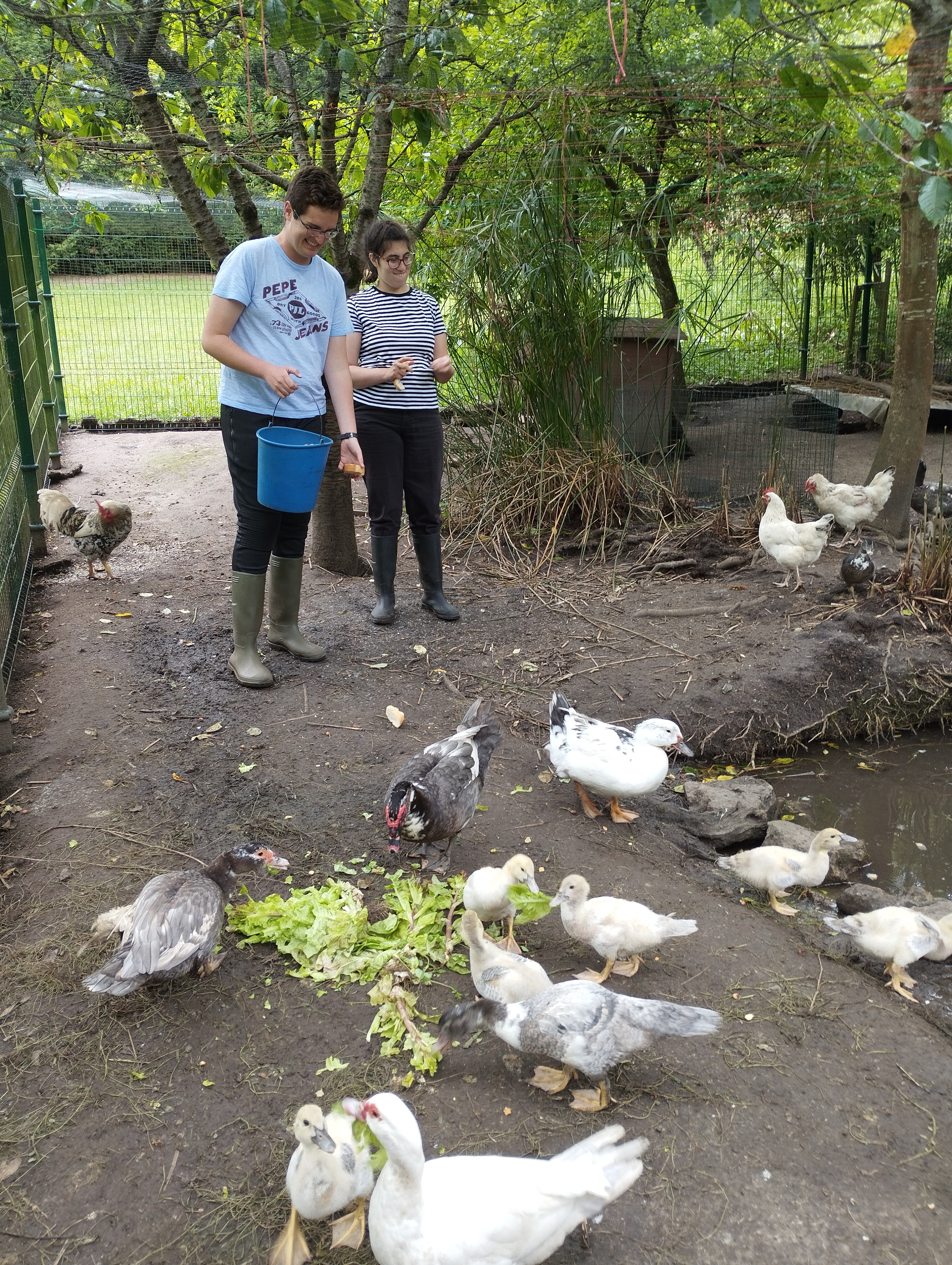 En la granja se cuida y se les da de comer a los animales: patos, gallos, gallinas, conejos...Con la recogida de los huevos y su venta, se invierte en la buena alimentación de los animales.