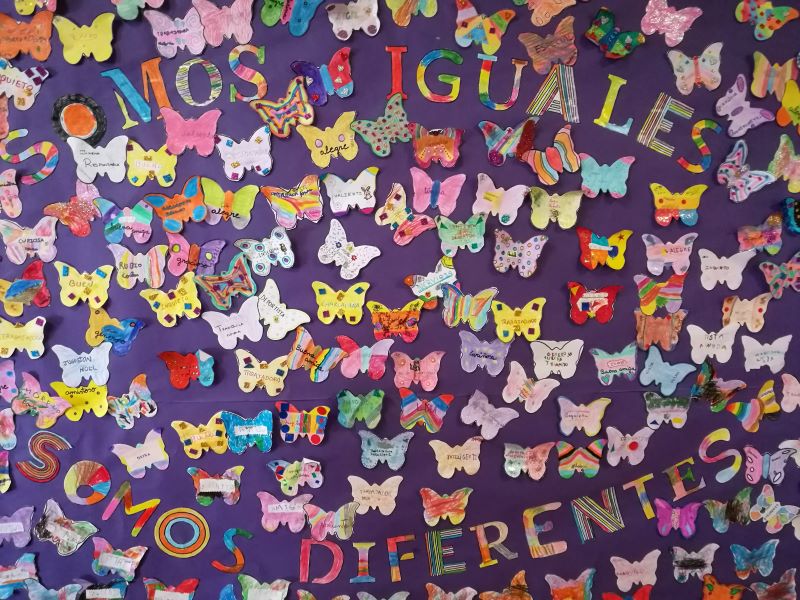 Para ello, el alumnado decora su particular mariposa con un adjetivo que le describe como persona y entre todos formamos un gran mural de mariposas en el hall con el lema “SOMOS DIFERENTES, SOMOS IGUALES” aportando colorido y alegría en un día que se lo merece.