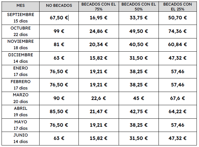 Os adjuntamos una tabla con el cálculo hecho a partir de los días lectivos de cada mes, para el alumnado que acuda el mes completo.