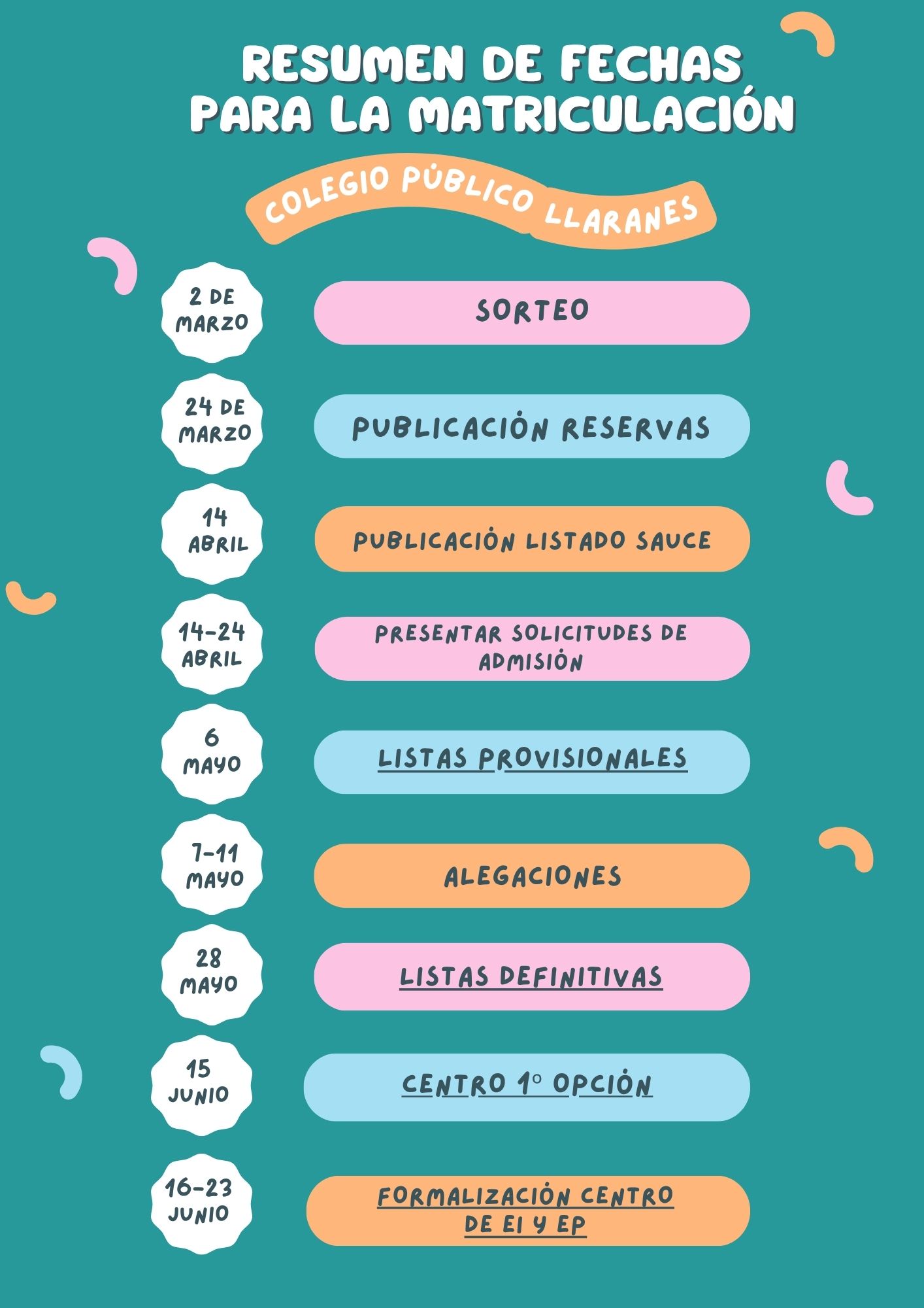 Se inician las actuaciones para solicitar la admisión en nuestro centro de todo el alumnado, tanto de E. Infantil como de E. Primaria. A continuación pueden ver las principales referencias y actuaciones necesarias con las fechas de que rigen el proceso.