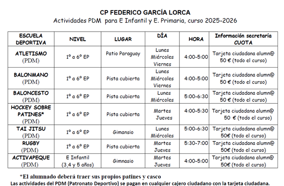 Las escuelas deportivas comenzarán su impartición el día 1 de octubre de 2025 y finalizarán el 29 de mayo de 2026.