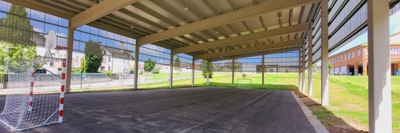Pista cubierta con porterías, canastas y con iluminación para realizar diferentes juegos y deportes.