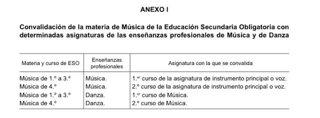 Se establecen las convalidaciones de la materia de Música de la Educación Secundaria Obligatoria con las asignaturas de las enseñanzas profesionales de Música o de Danza que se especifican en el anexo I.