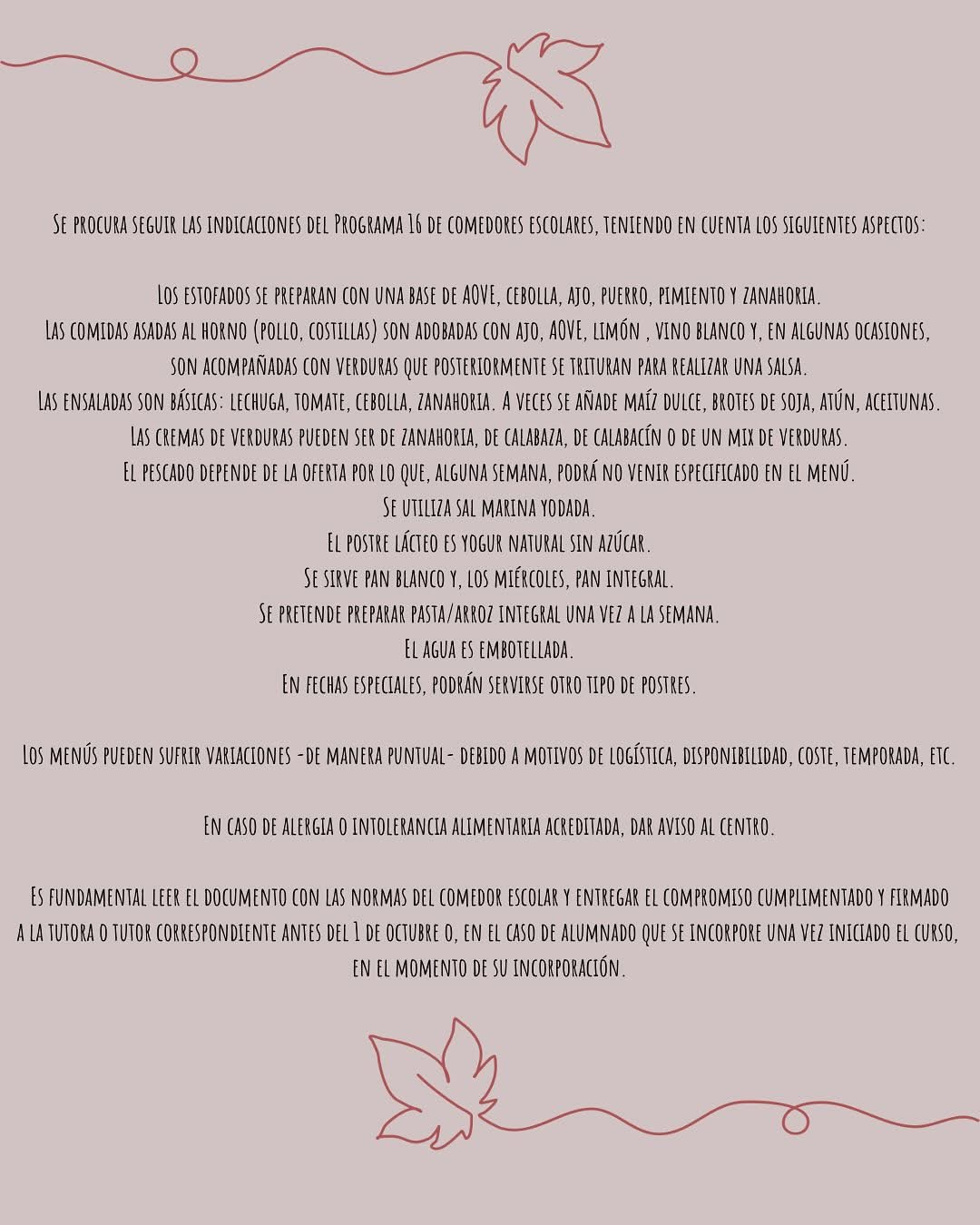 Los menús, expuestos en las RRSS del centro, se elaboran mensualmente en base a una dieta lo más sana y equilibrada posible. De manera puntual, enviamos dichos menús a la responsable de la estrategia NAOS que los supervisa, nos ofrece recomendaciones y asesoramiento. Se tienen presentes las alergias y/o intolerancias alimentarias justificadas con informe médico. Recordamos la necesidad de informar de estas cuestiones en Dirección a principios de curso o en el momento en que se detecten las alergias y/o intolerancias. Próximamente se pondrá en marcha el Recetario Viajero y algunos viernes de prepararán los platos elegidos.
