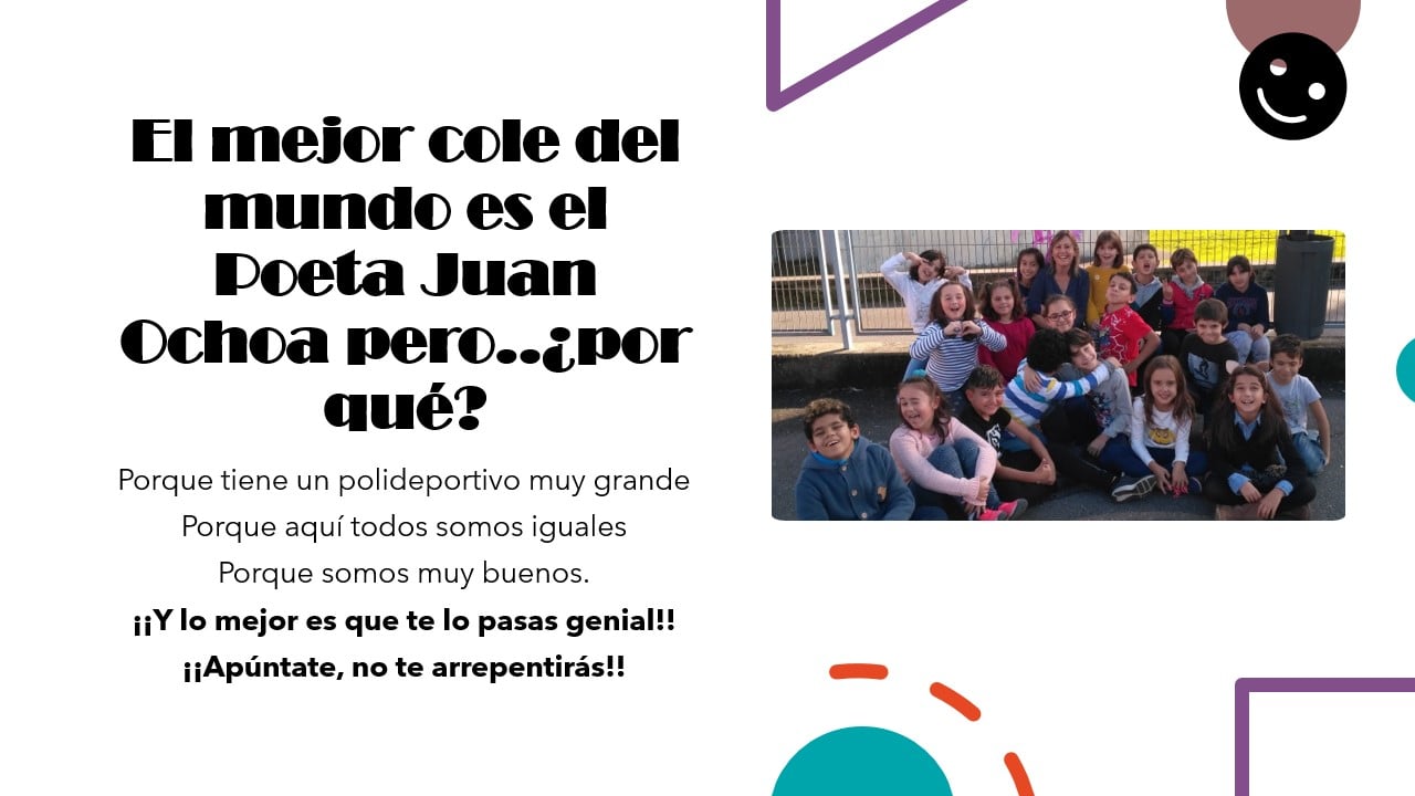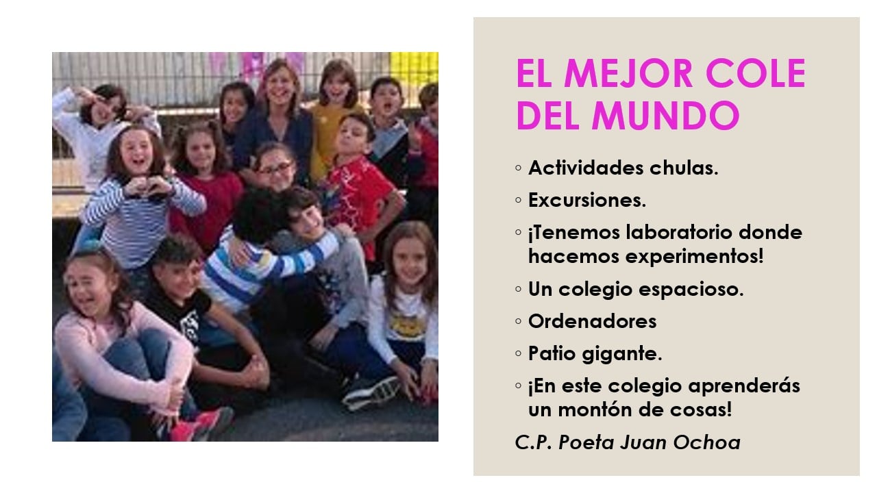 YA se acerca el momento de elegir colegio... algunos padres y madres ya nos están preguntando... este año hemos preparado la campaña para dar a conocer nuestro cole con los protagonistas principales , nuestro alumnado. Nos gustaría que nos ayudaseis a difundir y a la vez que os sintáis orgullosos de este alumnado tan genial que tenemos.