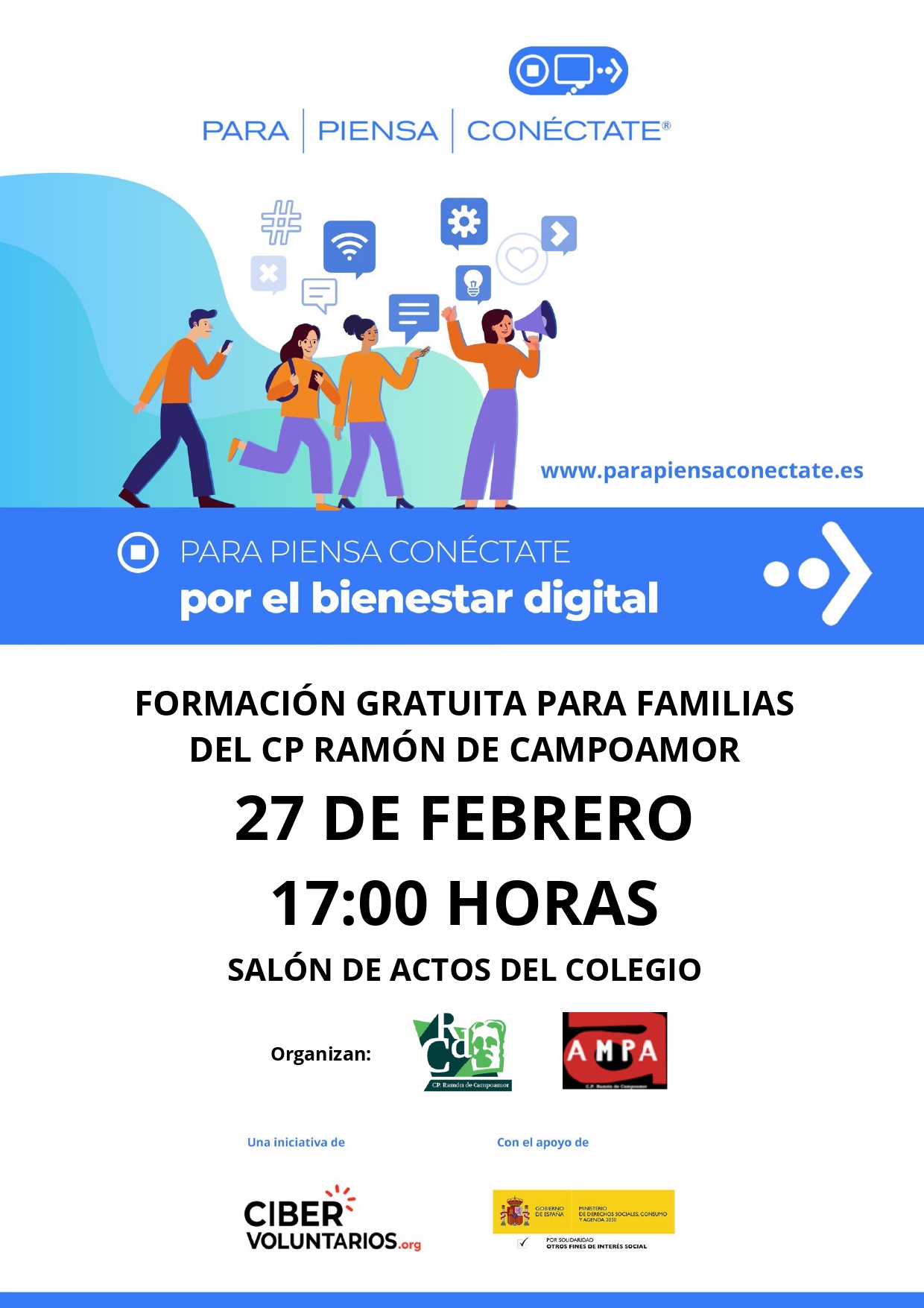 Desde el centro y la AMPA hemos organizado, en colaboración con la Fundación Cibervoluntarios, una formación gratuita destinada a las familias del colegio sobre el bienestar digital, que se celebrará el próximo 27 de febrero a las 17:00 horas.