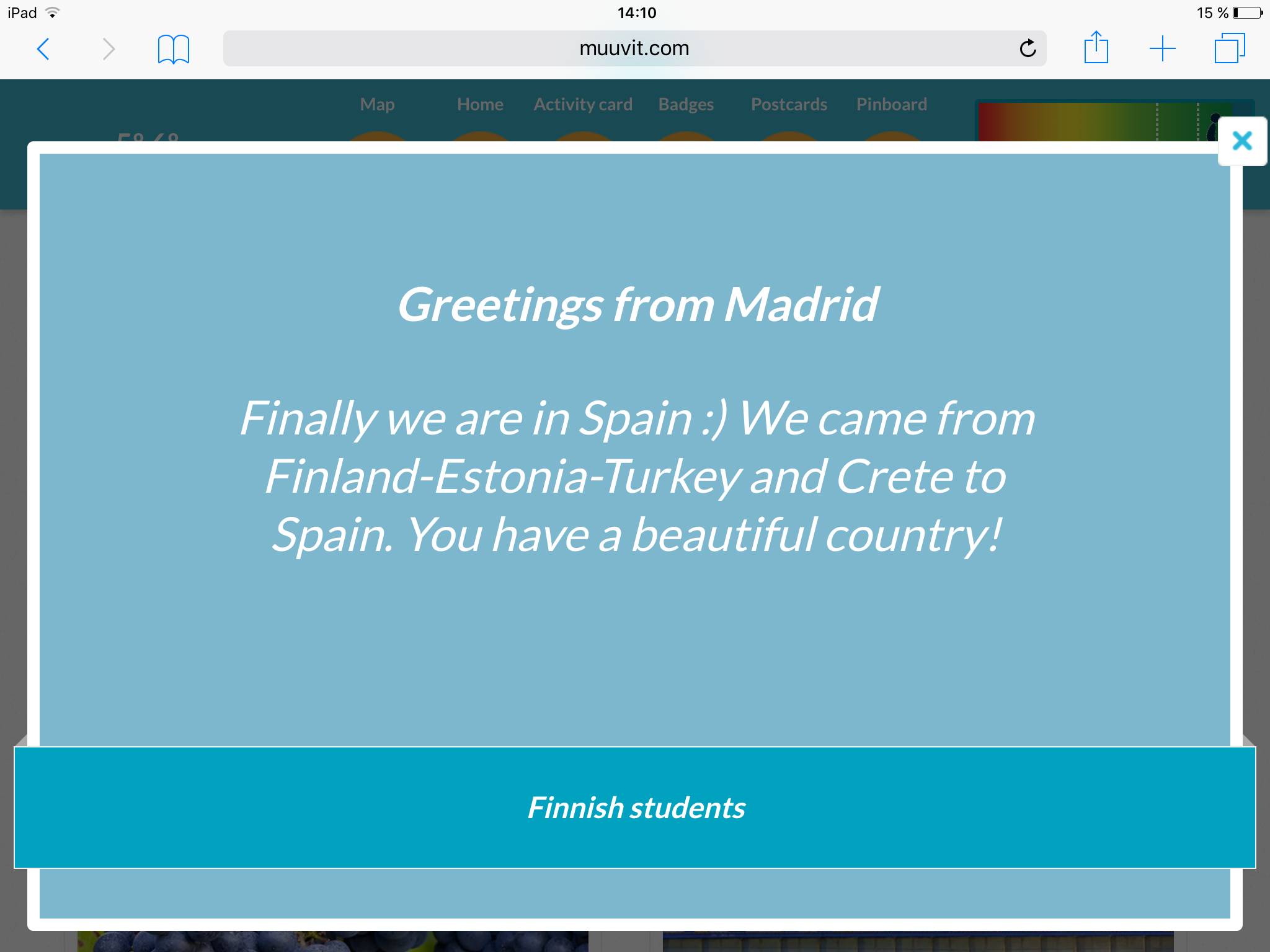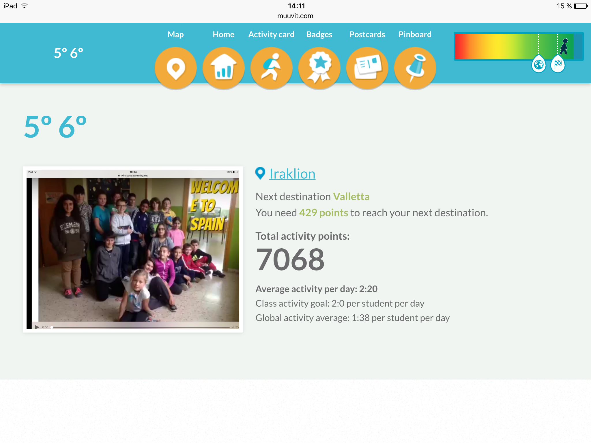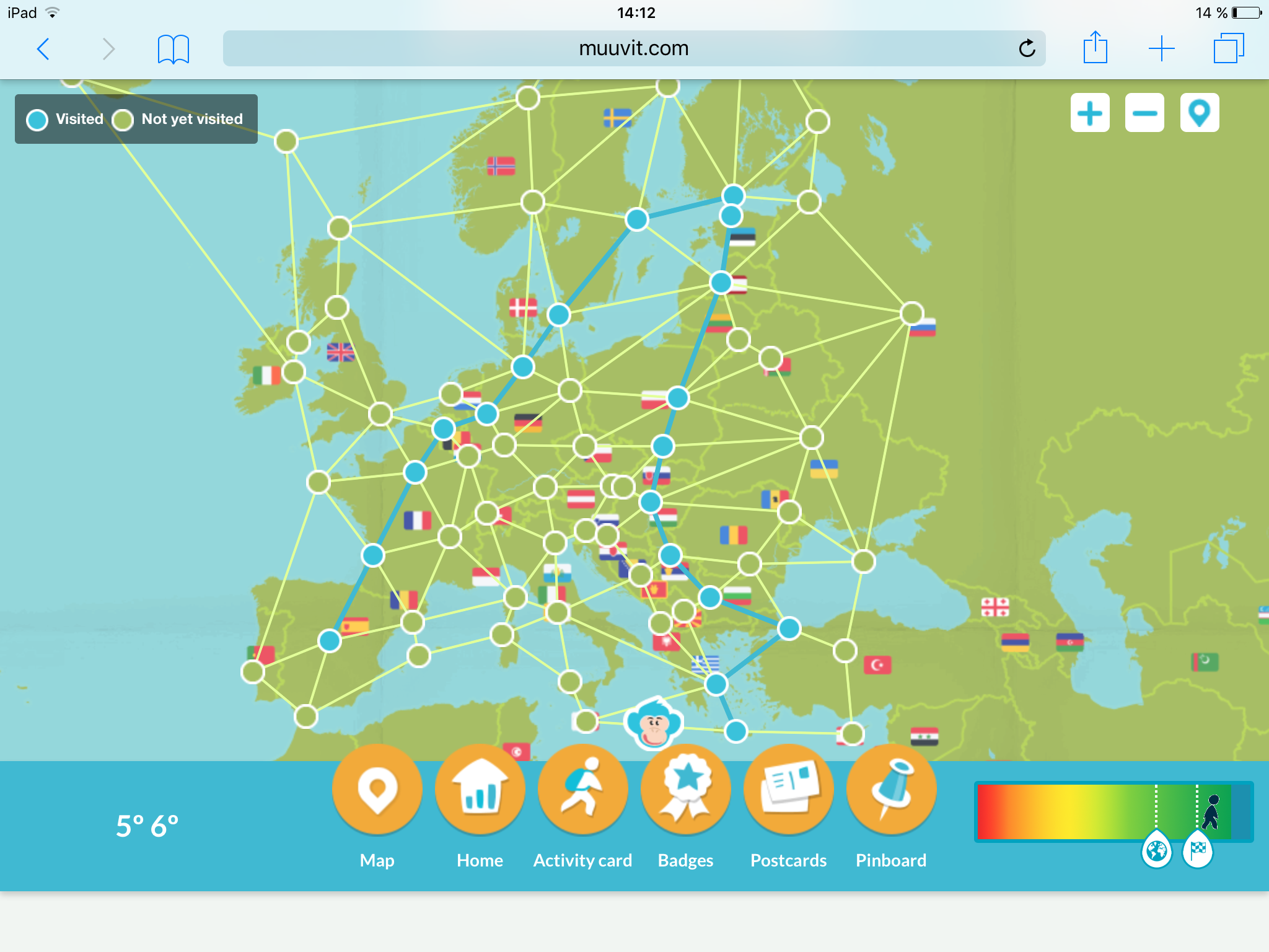 Con la aplicación finlandesa MUUVIT, todos hacemos ejercicio. Por cada 10' de ejercicio diario, recorremos 10km en un mapa virtual. El objetivo es llegar lo más lejos posible. Durante el viaje visitamos ciudades y enviamos postales. Es tan motivante que todos nos esforzamos y sumamos tantos kms que visitamos Estonia, Finlandia, Turquía y Grecia.