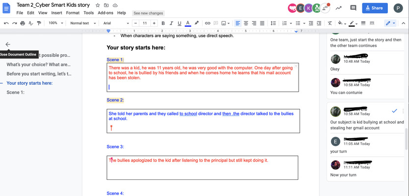ESCRITURA COLABORATIVA : EN EQUIPOS MULTINACIONALES ESCRIBIMOS EN DOCUMENTOS COMPARTIDOS DE GOOGLE UNA HISTORIA SOBRE CYBERBULLYING