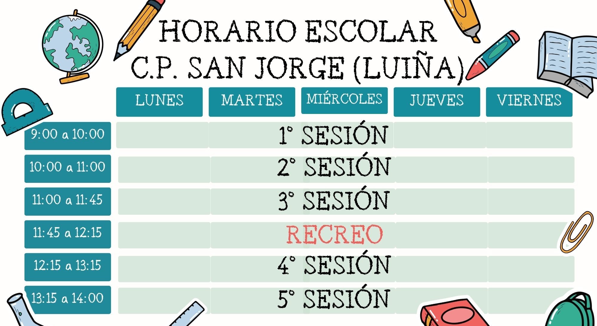 - El resto del curso, de Octubre a Mayo, la jornada será de 9 de la mañana a 2 de la tarde, con el correspondiente recreo de 30 minutos de 11:45 a 12:15 horas.
