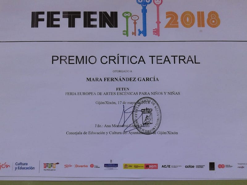 Nuestra alumna de 3ºB Mara Fernández García, recogió el pasado jueves 17 su premio a la crítica escrita teatral FETEN 2018.