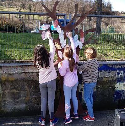 Este curso, además de las actividades de las aulas, hemos hecho una actividad colectiva en la que ha participado todo el colegio. Dicha actividad tuvo lugar después del recreo. Nos juntamos todos en el patio para colgar las mazorcas de cacao con nuestros DULCES PENSAMIENTOS en los cacaoteros .