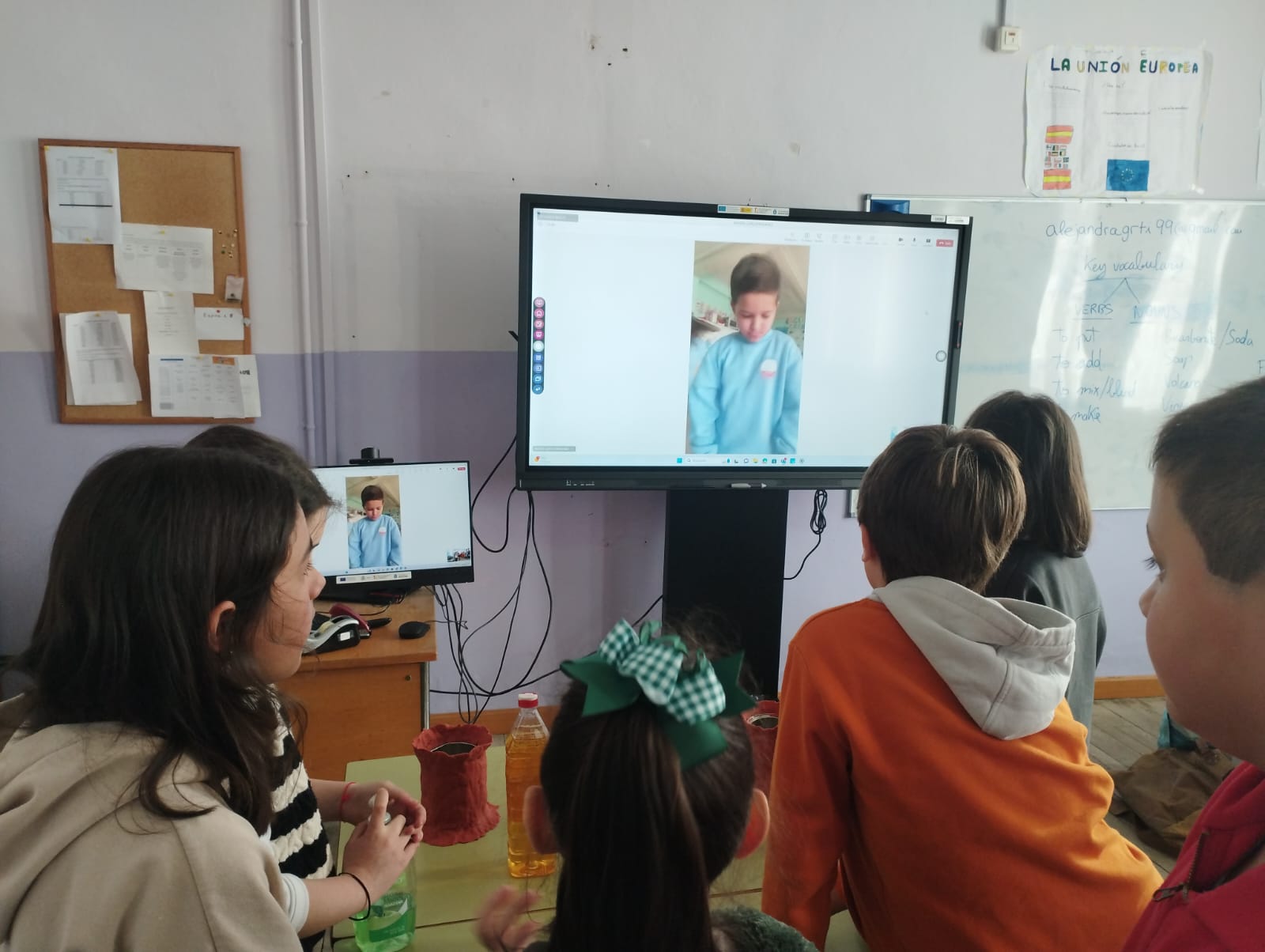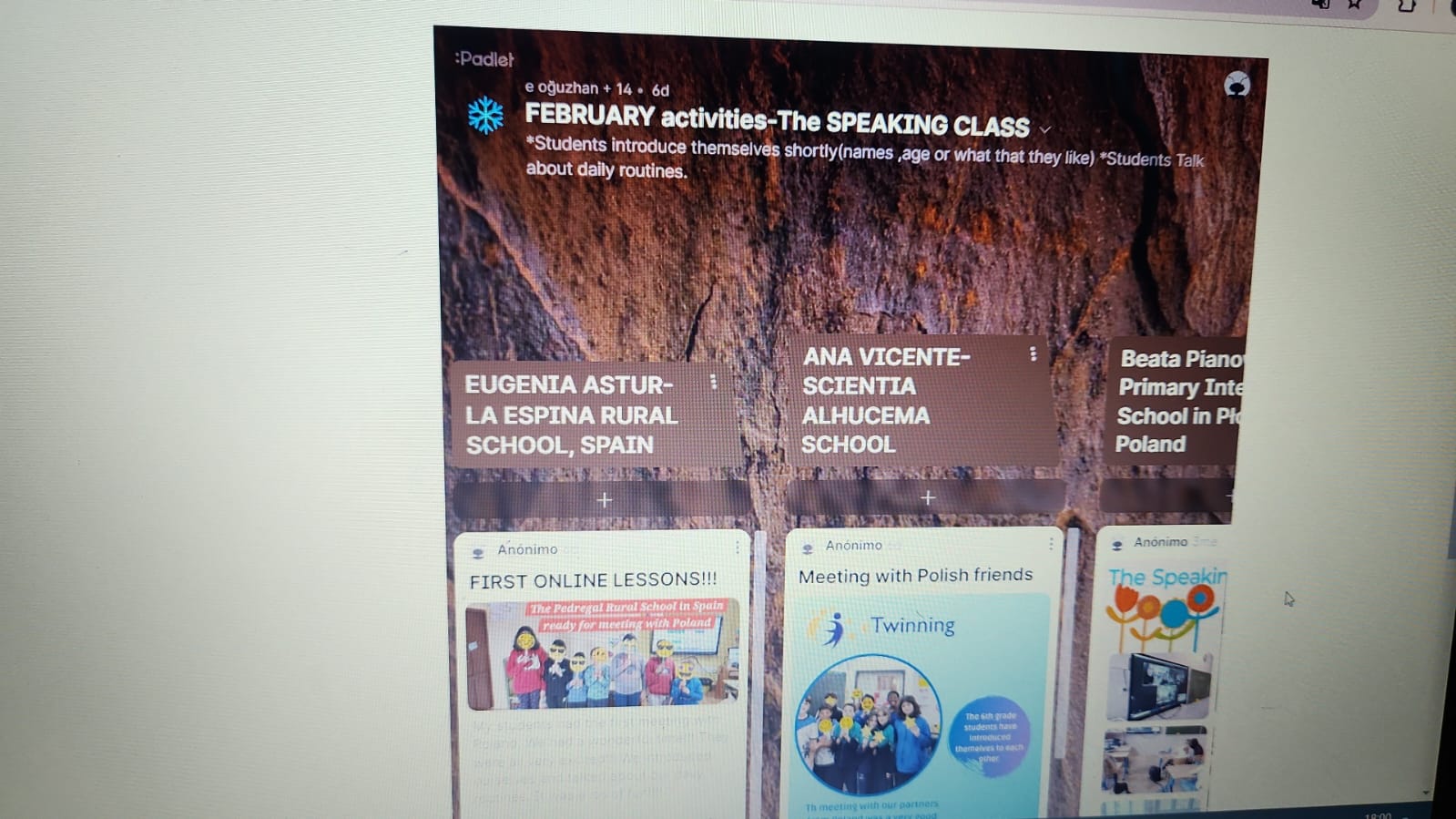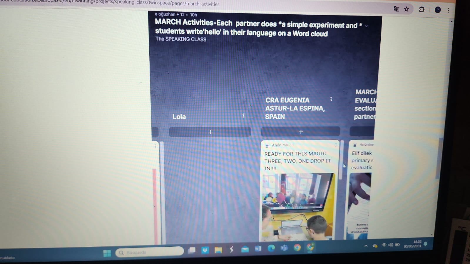Este año nuestro E-twinning Project se llamo The Speaking class y fue con los siguientes países: Turquía, Grecia, Polonia y España. Consistió en mantener encuentros vía Teams con los diferentes niñas y niños de otros coles y ¡como no! nuestro medio de comunicación era el inglés. En Ferbrero nos presentábamos y contábamos cosas que nos gustaban y que hacíamos todos los días. En Marzo preparamos dos Canvas uno con cosas típicas de España y otro de Asturias e hicimos dos experimentos explicando en inglés como se hacían, uno sobre un volcán y el otro sobre una mezcla de colores. Les encantó hacerlo y ver otros. En Abril grabaron una canción con la colaboración de Nerea la profe de Música y la compartieron y jugaron al juego de Simon says vía Teams. En mayo, compartieron algún que otro juego sobre comida y deporte y hablaron sobre el tiempo el día que se conectaban. Y por último este mes hacen la simulación de un restaurante. También de forma colaborativa todos los países grabaron la cancion de Happy. Se asociaron a clubs y compartieron recetas y tuvieron intercambio de cartas. Fue toda una experiencia muy enriquecedora tanto para el alumnado como para el profesorado del cole.