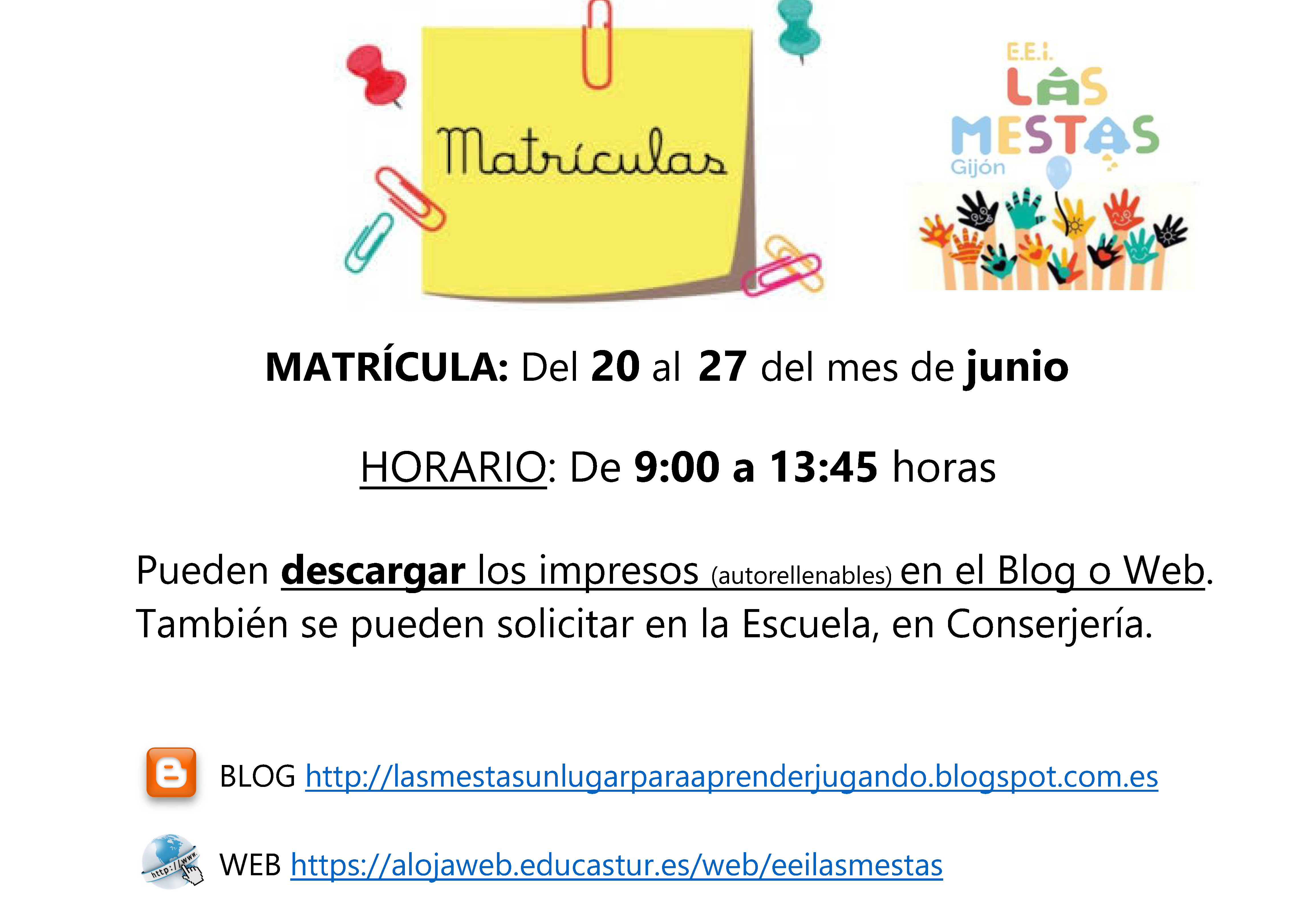 Los DOCUMENTOS de MATRÍCULA, que se tienen que presentar en JUNIO 2023, en el Centro admitido, los de la E.E.I. Las Mestas, aún no están ACTUALIZADOS.