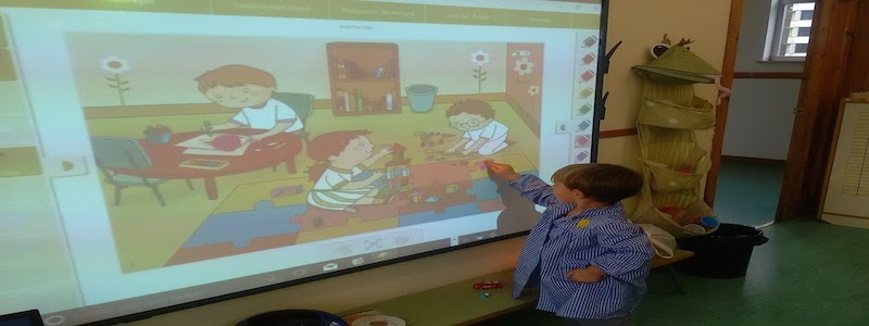 • Halls activos: Uno de ellos está destinado a la Biblioteca del Centro (donde podrán acceder a todos los cuentos y recursos disponibles) y el otro se utiliza para trabajar el proyecto de Medio Ambiente que se está llevando a cabo en el Centro. Ambos disponen de medios audiovisuales que permiten la proyección de recursos relacionados con los contenidos a trabajar.