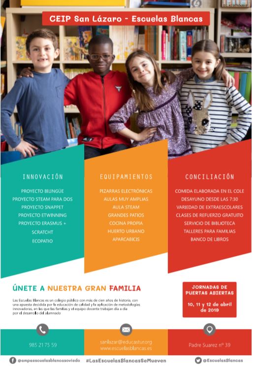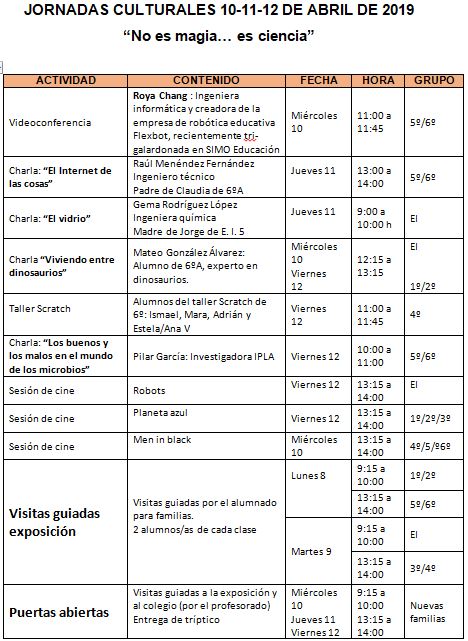 Coincidiendo con las Jornadas Culturales, que este año se celebran bajo el lema “No es magia… es ciencia”, el centro desarrolla un programa de PUERTAS ABIERTAS, dirigido a quien quiera conocer el centro y así tener más elementos de juicio para que su hijo/a pueda incorporarse a nuestro colegio.