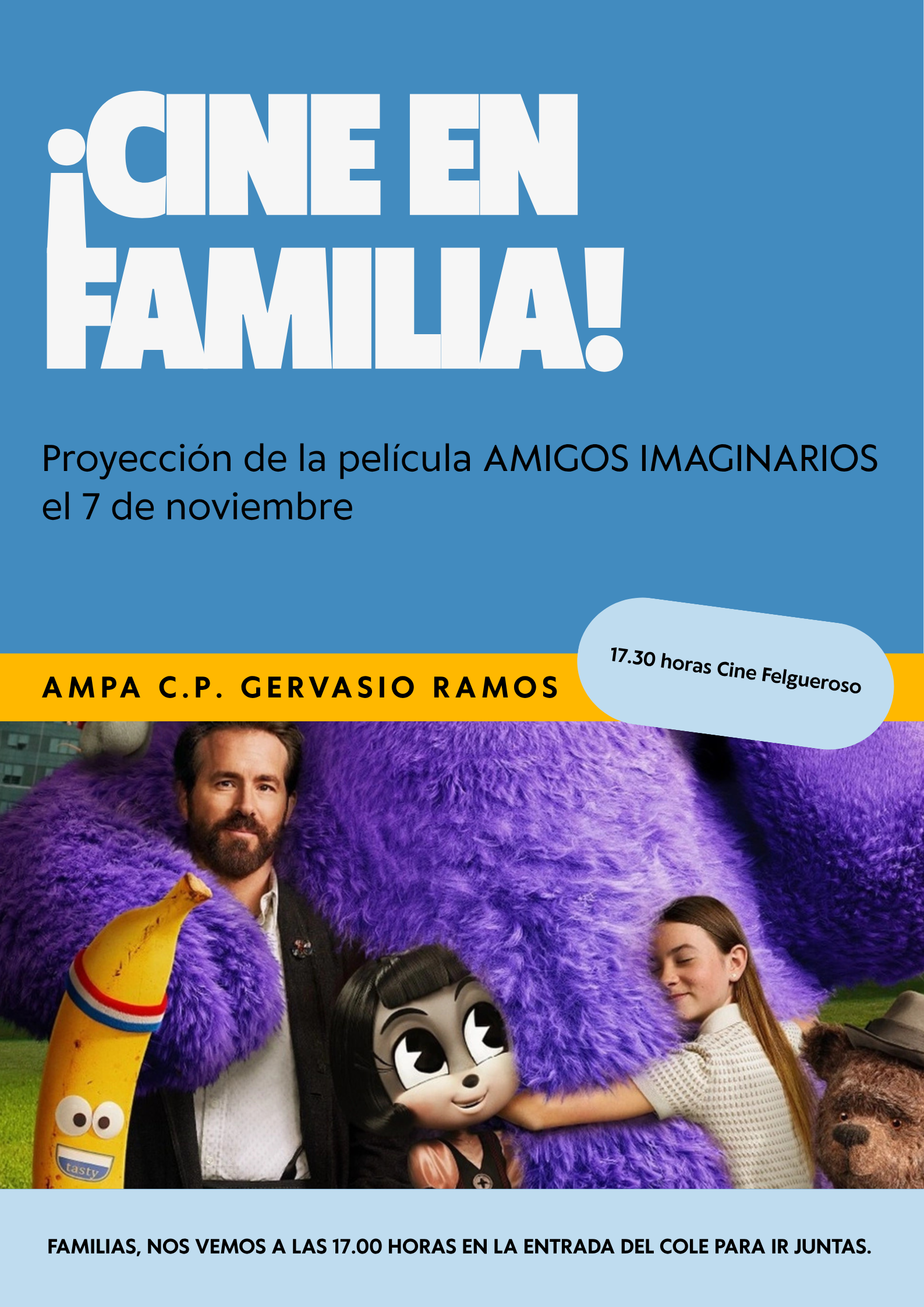 Desde la AMPA, animamos a todas las familias a participar e ir juntas al cine. Nos vemos a las 17.00 horas a la entrada del Cole.