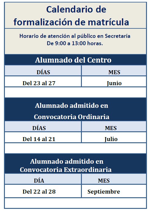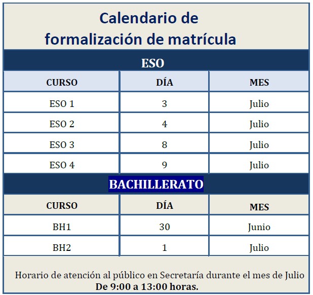 Todo el alumnado de nueva incorporación al centro (ESO y Bachillerato) podrá recoger la documentación de matricula en la Secretaría del centro a partir del lunes 23 de junio o descargarla de la página web del centro y formimalizarán la matrícula según las instrucciones y el calendario adjunto.