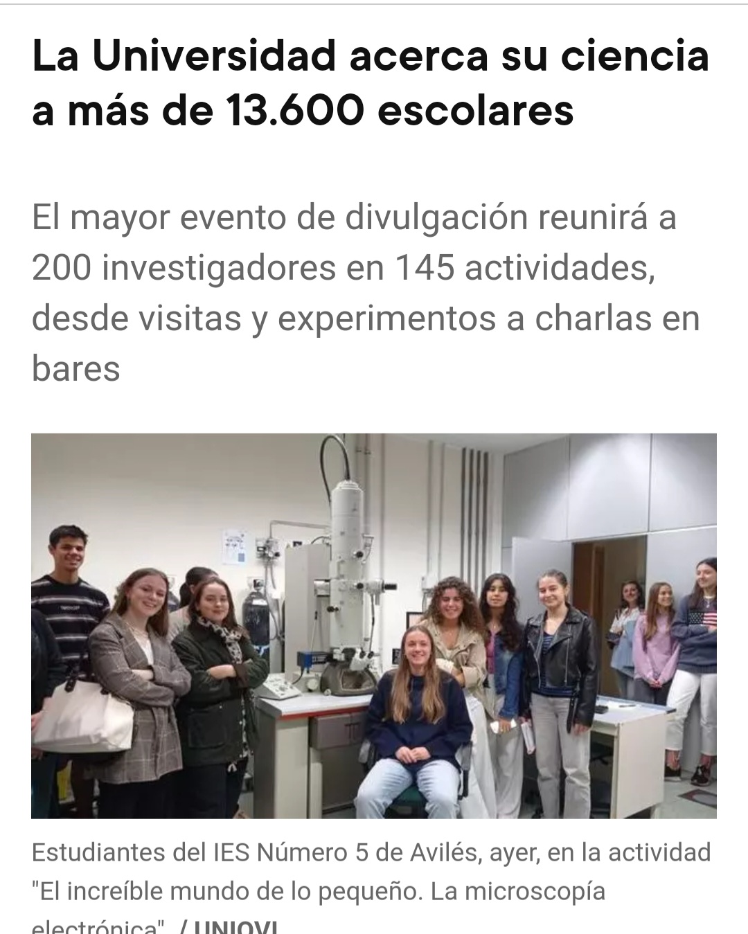 En la jornada del lunes 5 de noviembre, nuestro alumnado de Biología, Geología y Ciencias Ambientales y Ciencias Aplicadas de 1º y 2º de Bachillerato han participado en la XXIV SEMANA DE LA CIENCIA Y LA INNOVACIÓN DE LA UNIVERSIDAD DE OVIEDO con dos talleres: "El increíble mundo de lo pequeño. Microscopía electrónica" y "El ritmo de las rocas. Explorando el ciclo exógeno".