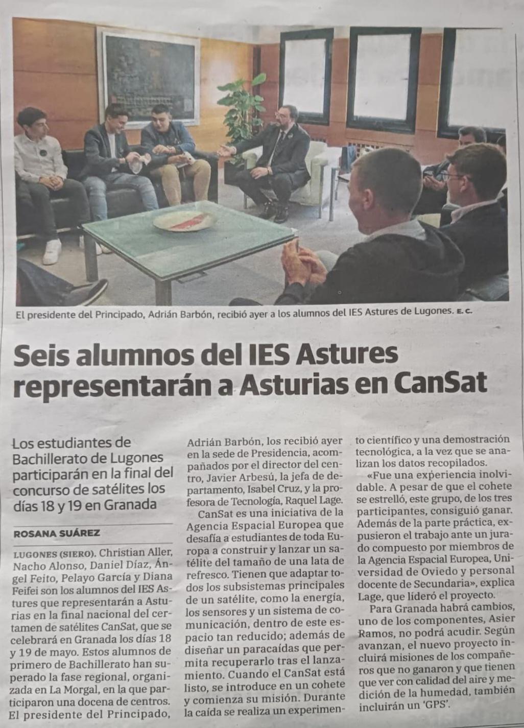IES Astures El pasado 5 de abril, el Presidente del Principado de Asturias, Adrián Barbón, recibió a los campeones de la fase regional del Desafío Cansat, se interesó por su proyecto, por su futuro y les dio ánimos para representar a Asturias, el próximo mes de mayo, en Granada.