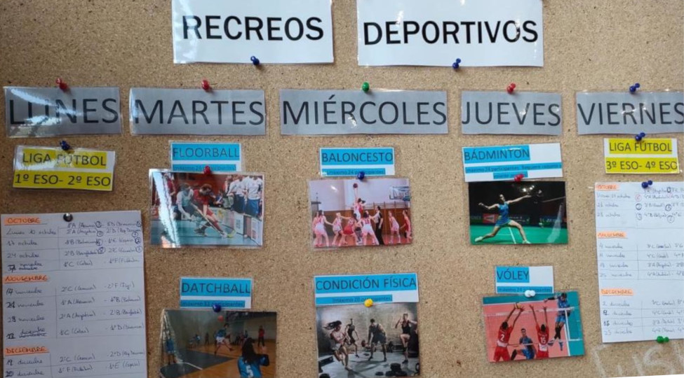 Recreos deportivos En nuestro instituto, cuando suena el timbre del recreo, y después de comer el pincho, tenemos muchas actividades donde elegir: fútbol, floorball, baloncesto, bádminton, datchball, condición física, vóley, etc.