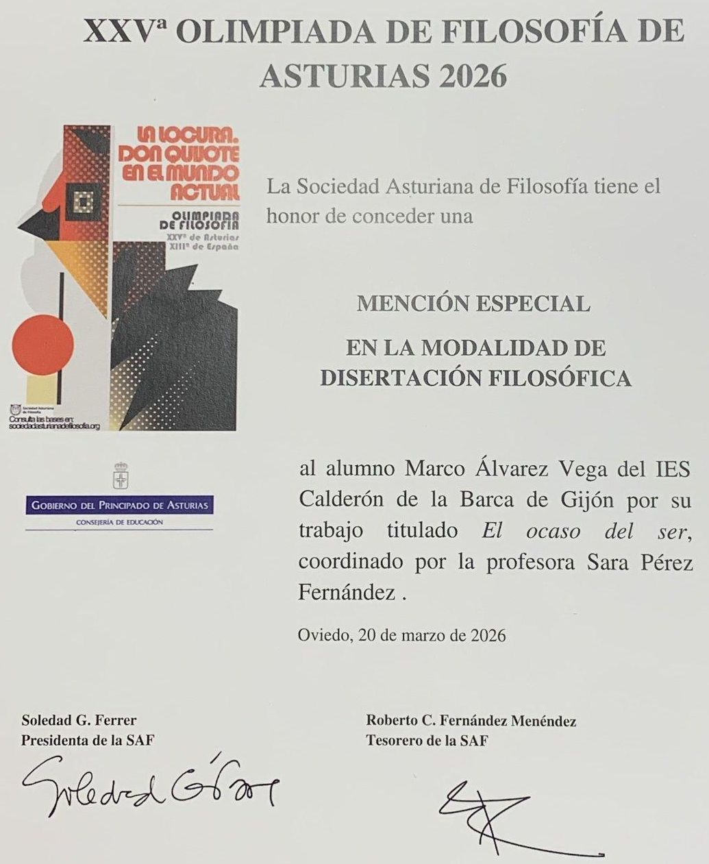 El alumno de nuestro instituto, Marco Álvarez Vega, de B1D, ha obtenido una mención de honor en la XXVI Olimpiada de Filosofía gracias a su ensayo titulado "El ocaso del ser" ¡Enhorabuena!