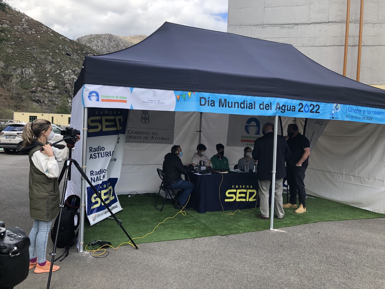 En el exterior de esta había una carpa de la cadena SER donde se retransmitía en directo Hoy por Hoy Asturias, y cuatro alumnos aportaron en antena sus opiniones y consejos sobre el correcto uso del agua, estuvieron muy simpáticos y se explicaron de maravilla https://consorcioaa.com/dia-mundia-agua-2022-hoy-por-hoy/