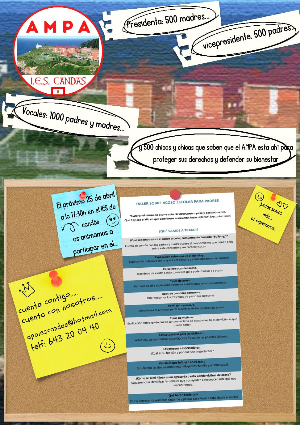 Compartimos con la comunidad educativa esta información que nos hace llegar el AMPA sobre de un Taller sobre acoso escolar para padres que tendrá lugar en el IES de Candás el próximo 25 de abril a las 17:30.