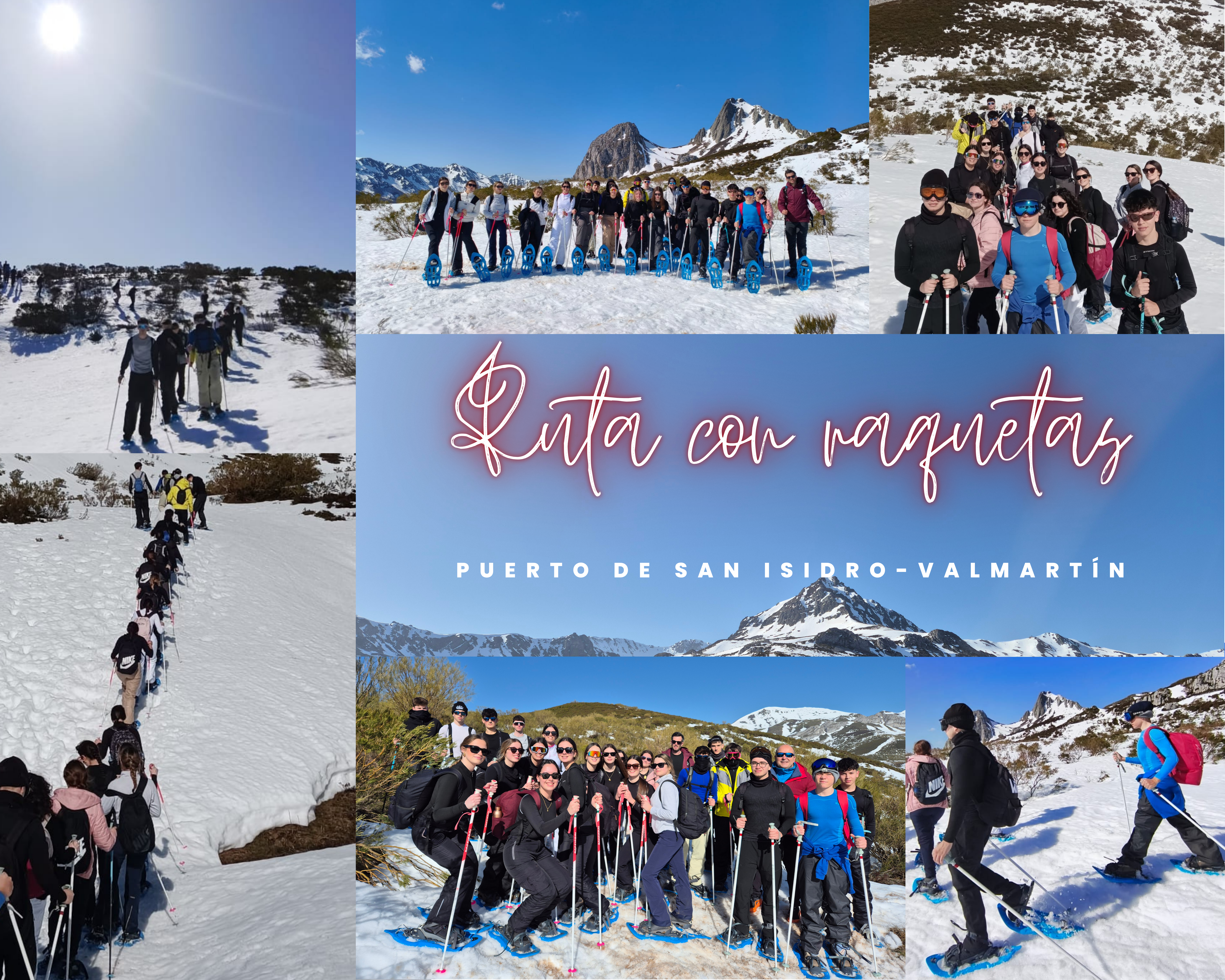 El jueves 26 de febrero el alumnado de la materia "Actividad física y salud", que el departamento de educación física tiene como optativa para 2º de bachiller, realizó una ruta con raquetas de nieve por los puertos que comparten Asturias y León. No tuvimos muchos huecos en el calendario por la alta densidad de exámenes concentrados en estas últimas semanas, así que aprovechamos el único día disponible que el calendario nos brindaba. Y, pese a que gran parte de la nieve a pie de la carretera de acceso ya se había derretido, por encima de los 1600 metros todavía pudimos disfrutar de bastante volumen de nieve acumulada. Durante tres horas y media transitamos, cerca de la estación invernal de San Isidro, por senderos nevados entre los picos Valmartín (1932 metros) y Torres (2104 metros).
