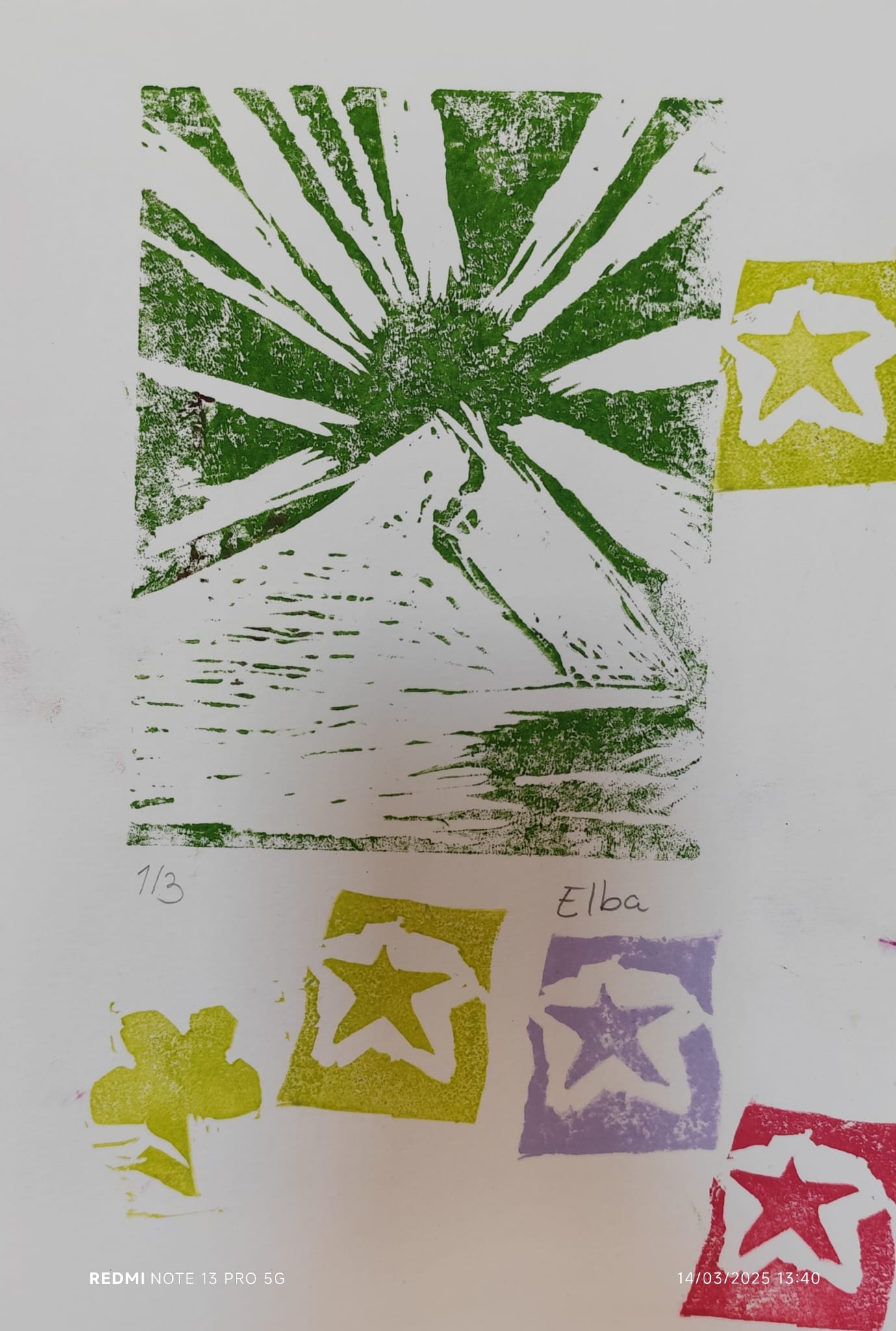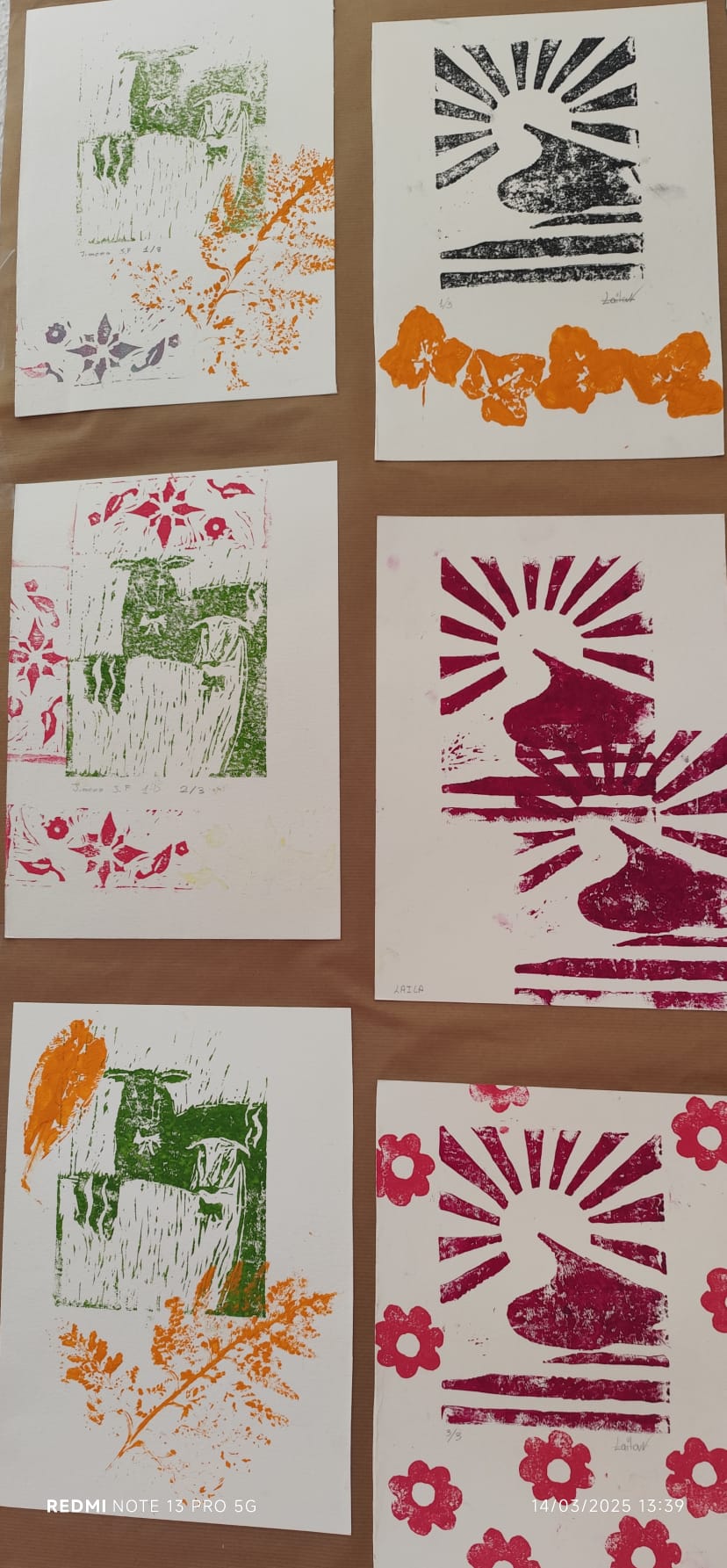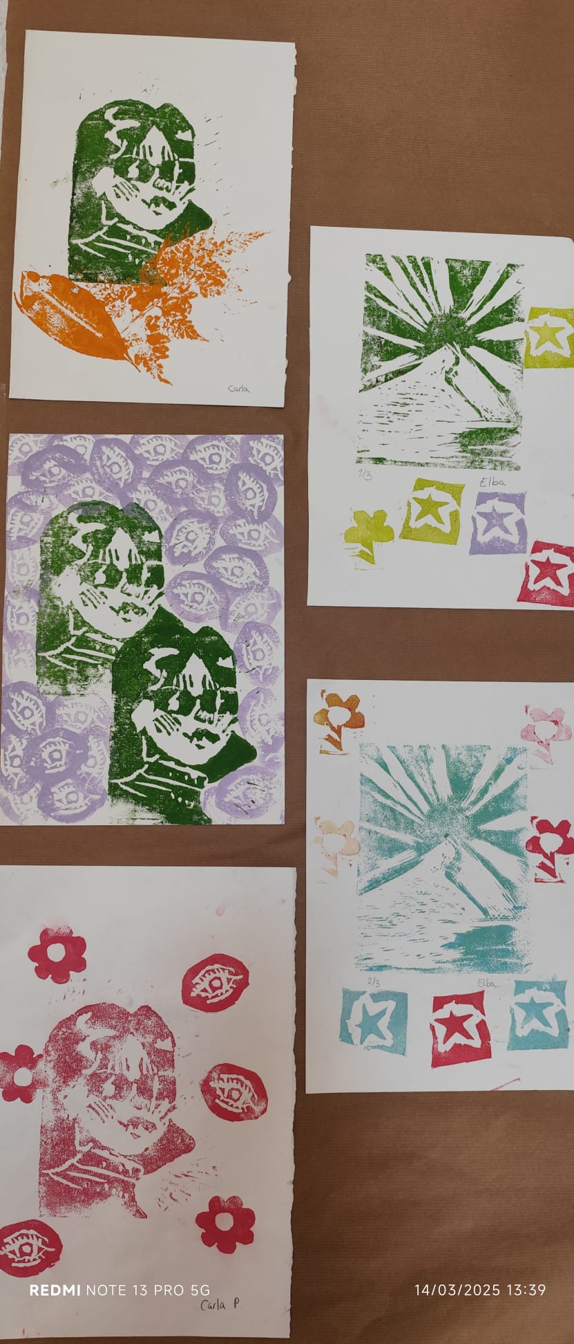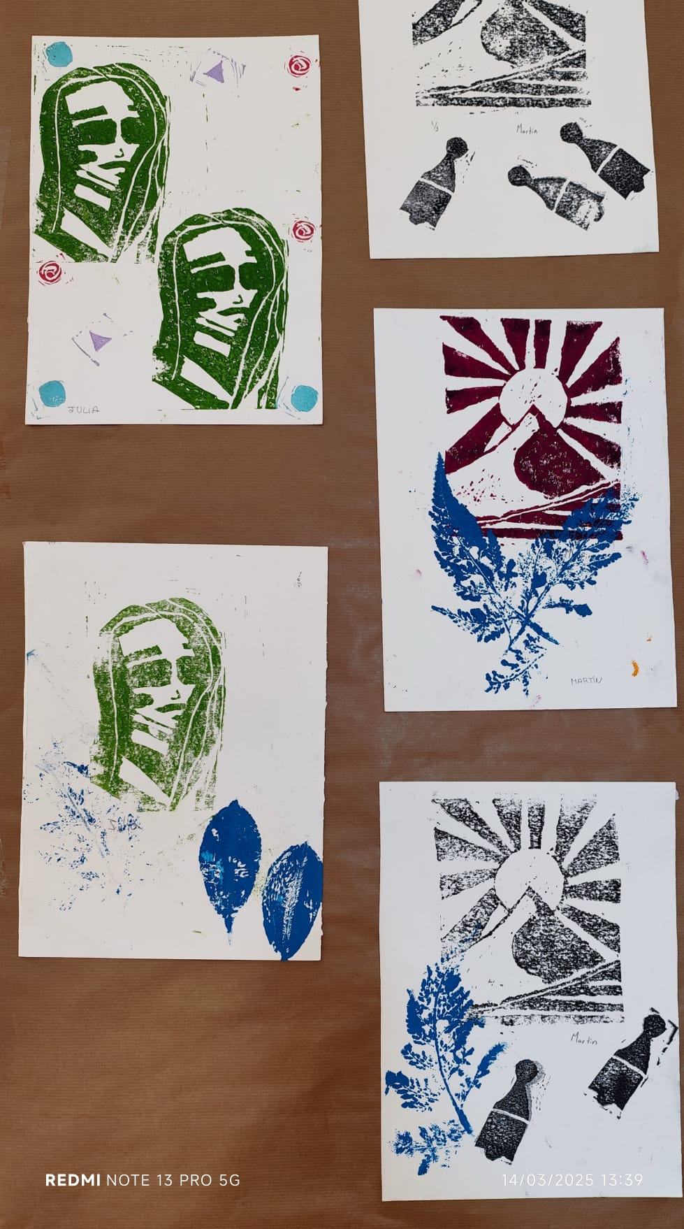 Los estudiantes que asisten a los recreos artísticos realizaron, con la ayuda de las profesoras Cristina y Ángela, estos magníficos trabajos con la técnica "grabado sobre linóleo".