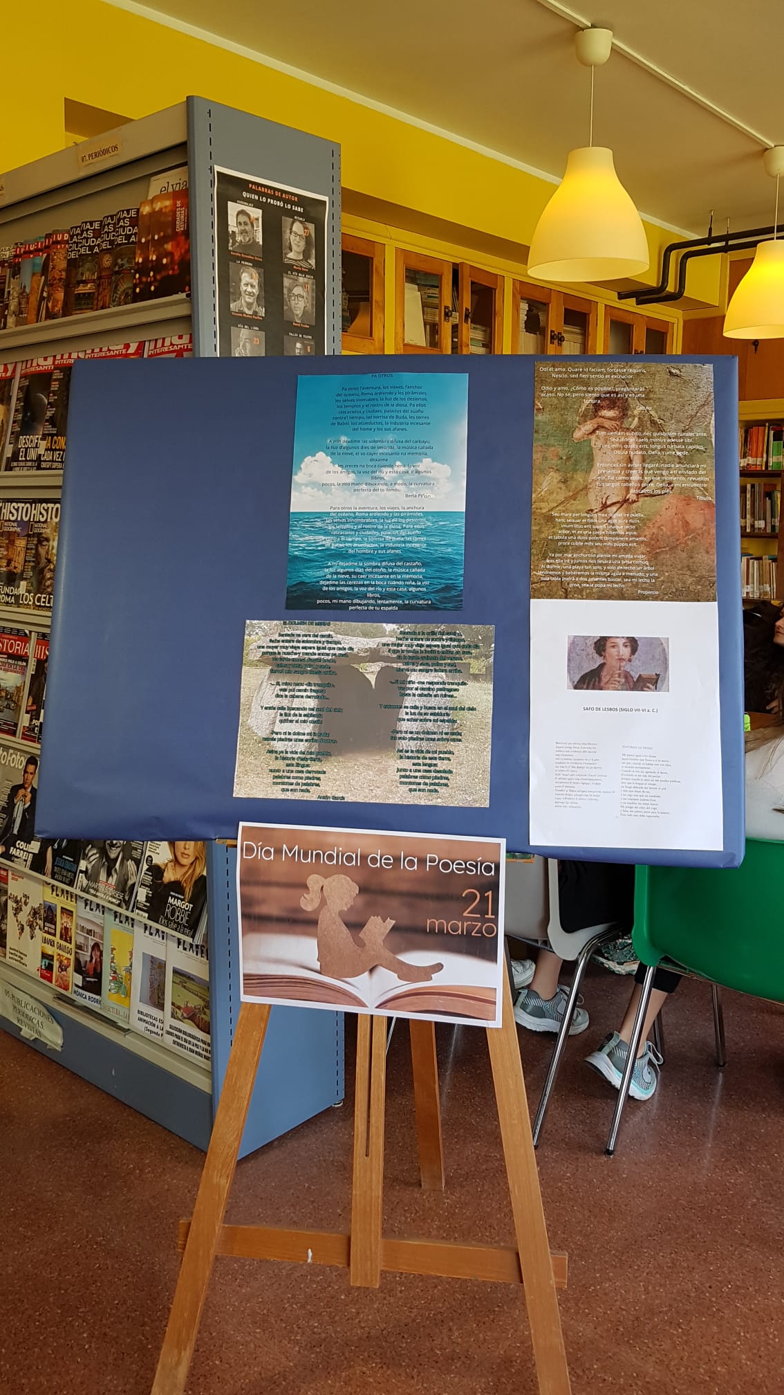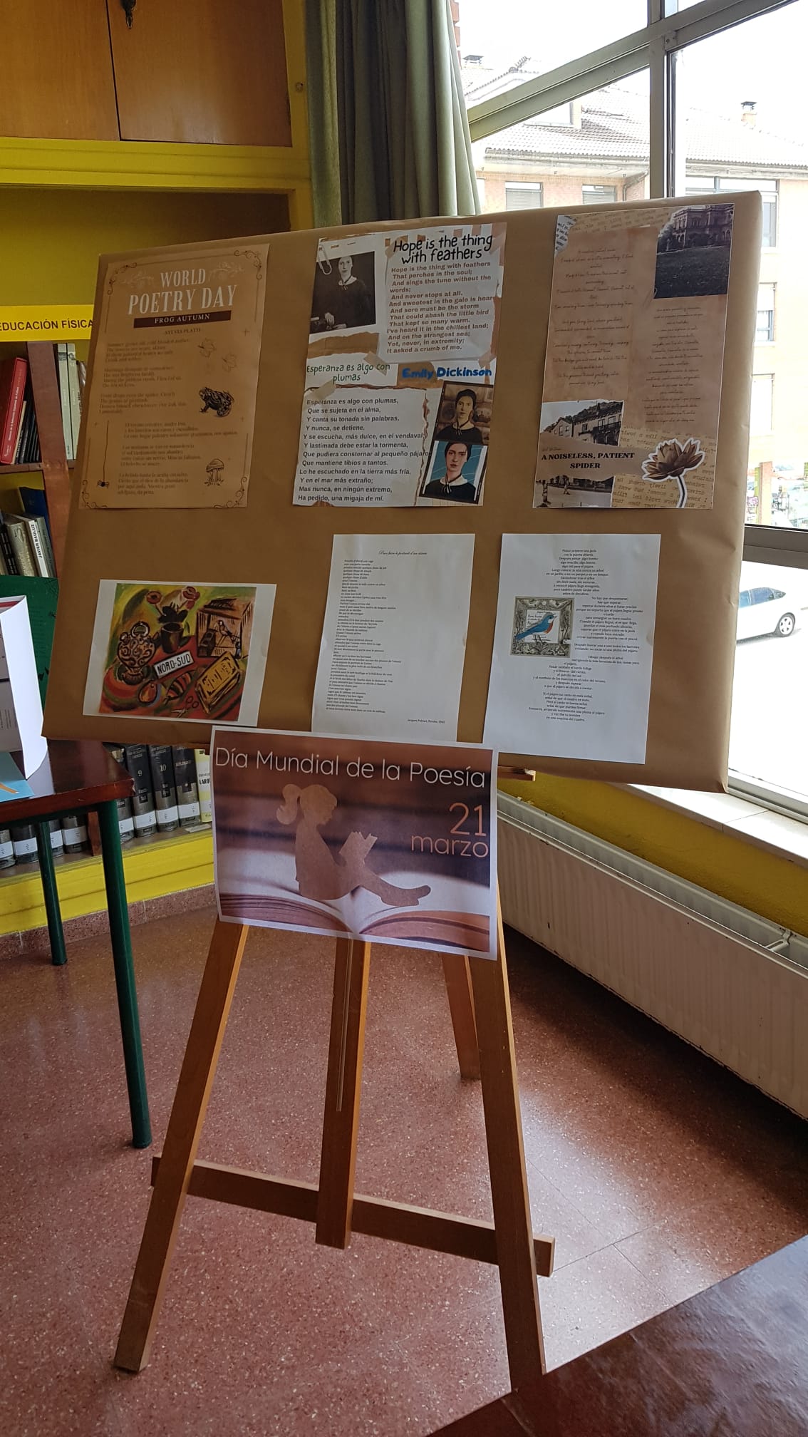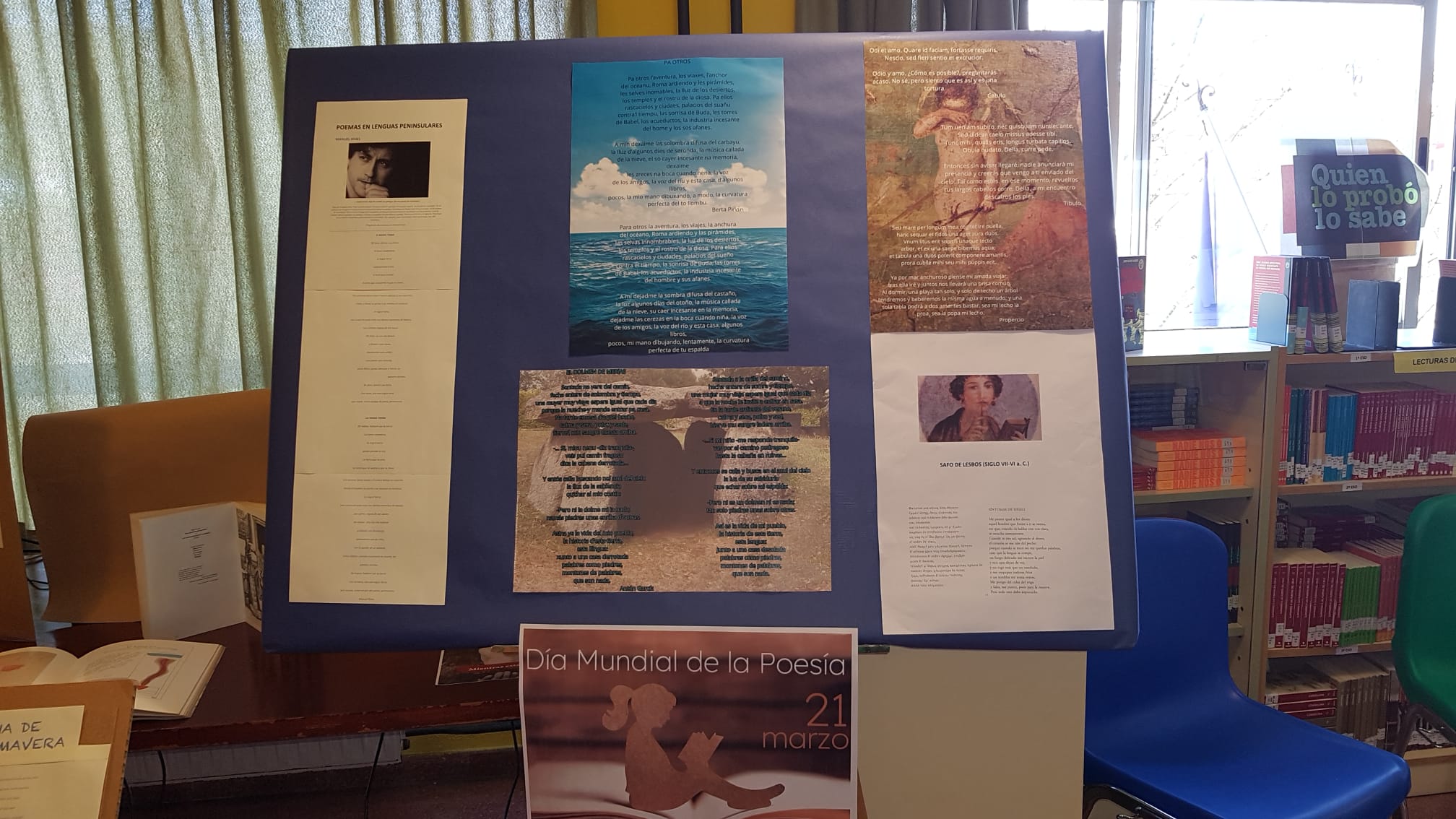 Con motivo del Día mundial de la poesía, 21 de marzo, se ha preparado en la Biblioteca de nuestro IES una pequeña exposición de poemas en diferentes lenguas. Agradecemos a los departamentos de Inglés, Francés, Griego, Lengua española (y asturiano) su colaboración.
