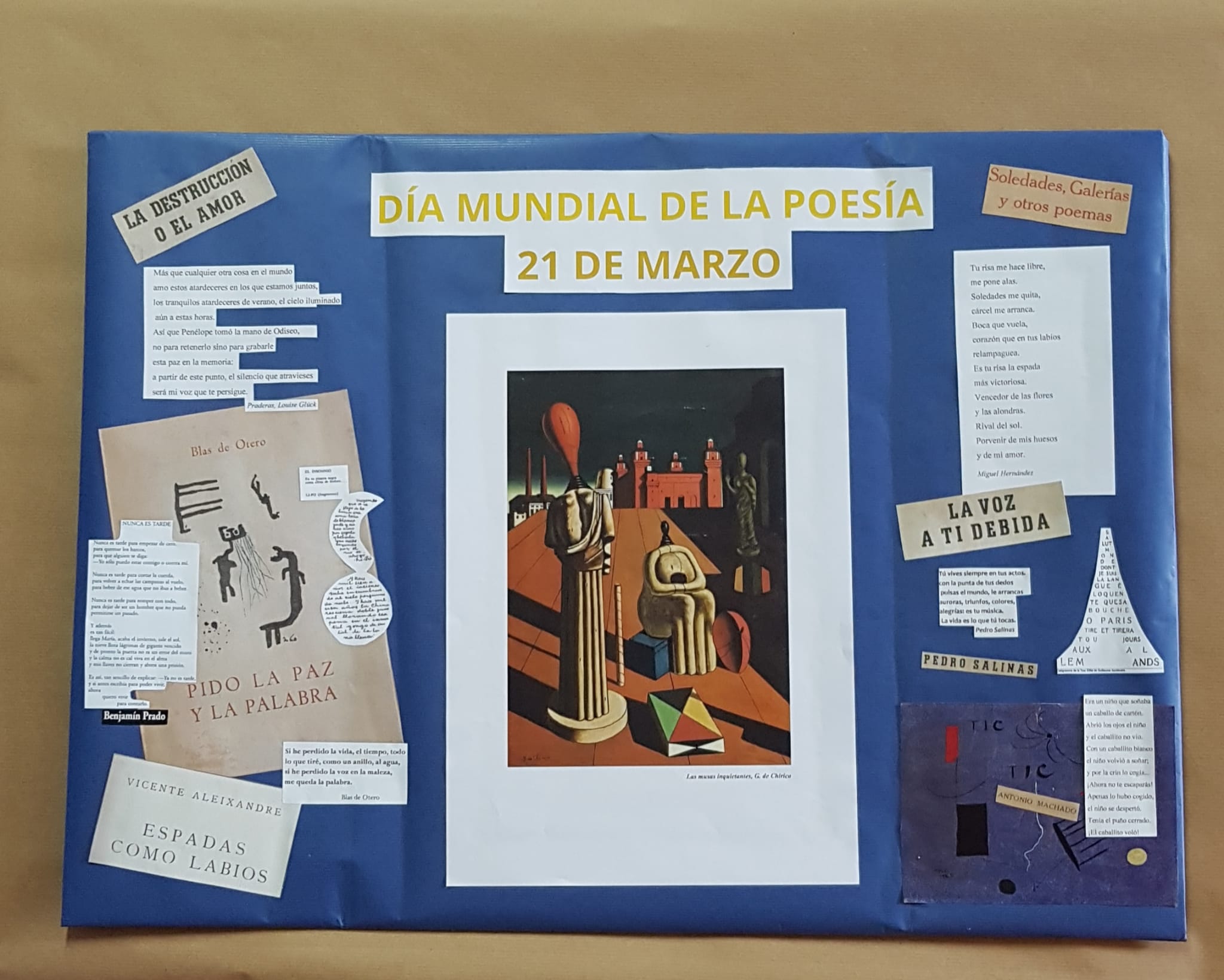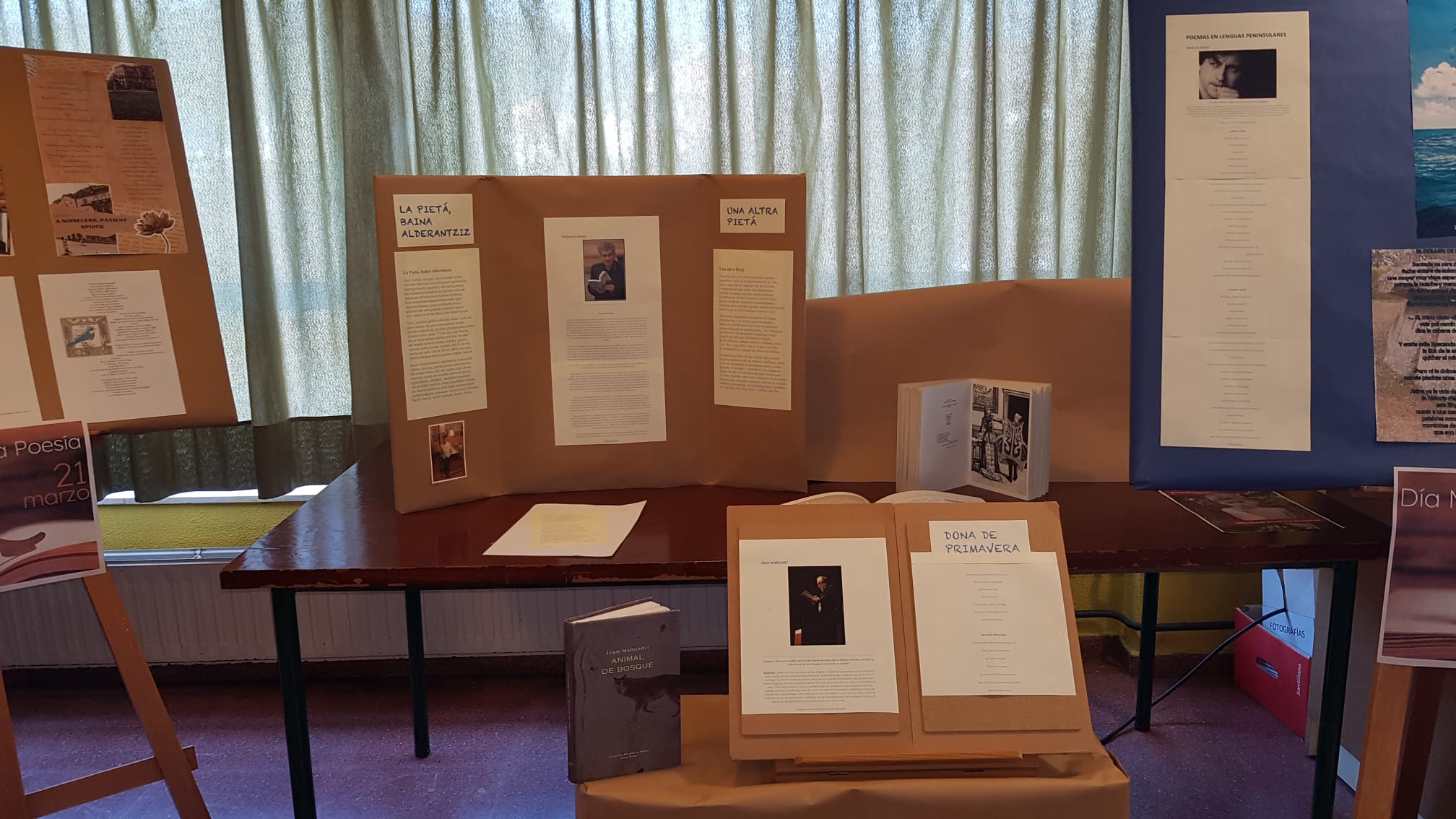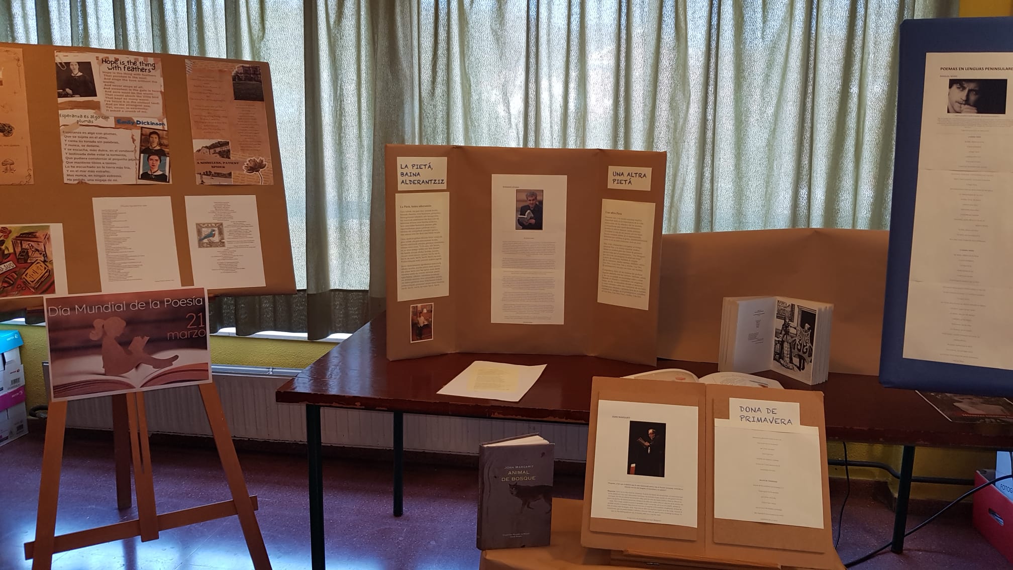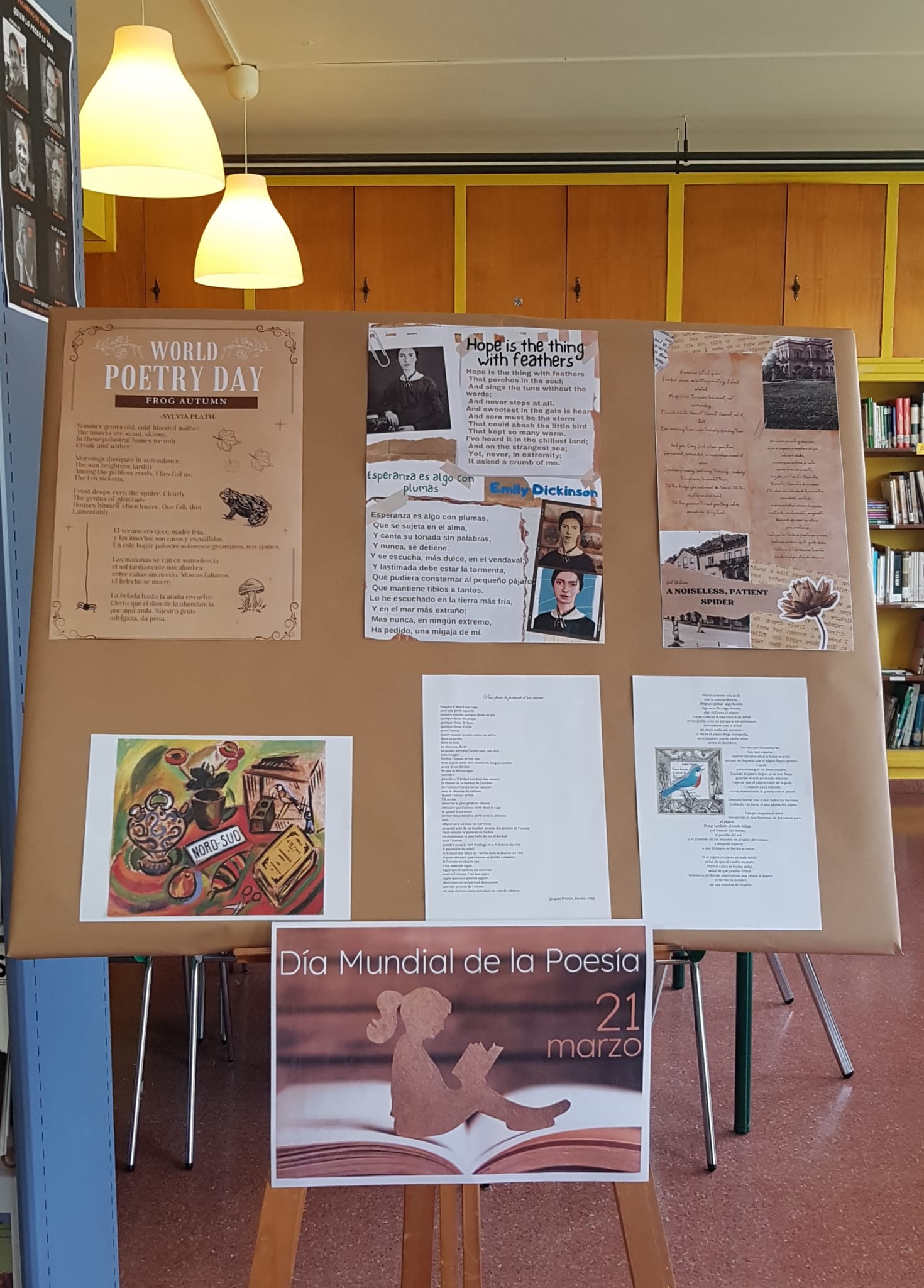 Con motivo del Día mundial de la poesía, 21 de marzo, se ha preparado en la Biblioteca de nuestro IES una pequeña exposición de poemas en diferentes lenguas. Agradecemos a los departamentos de Inglés, Francés, Griego, Lengua española (y asturiano) su colaboración.