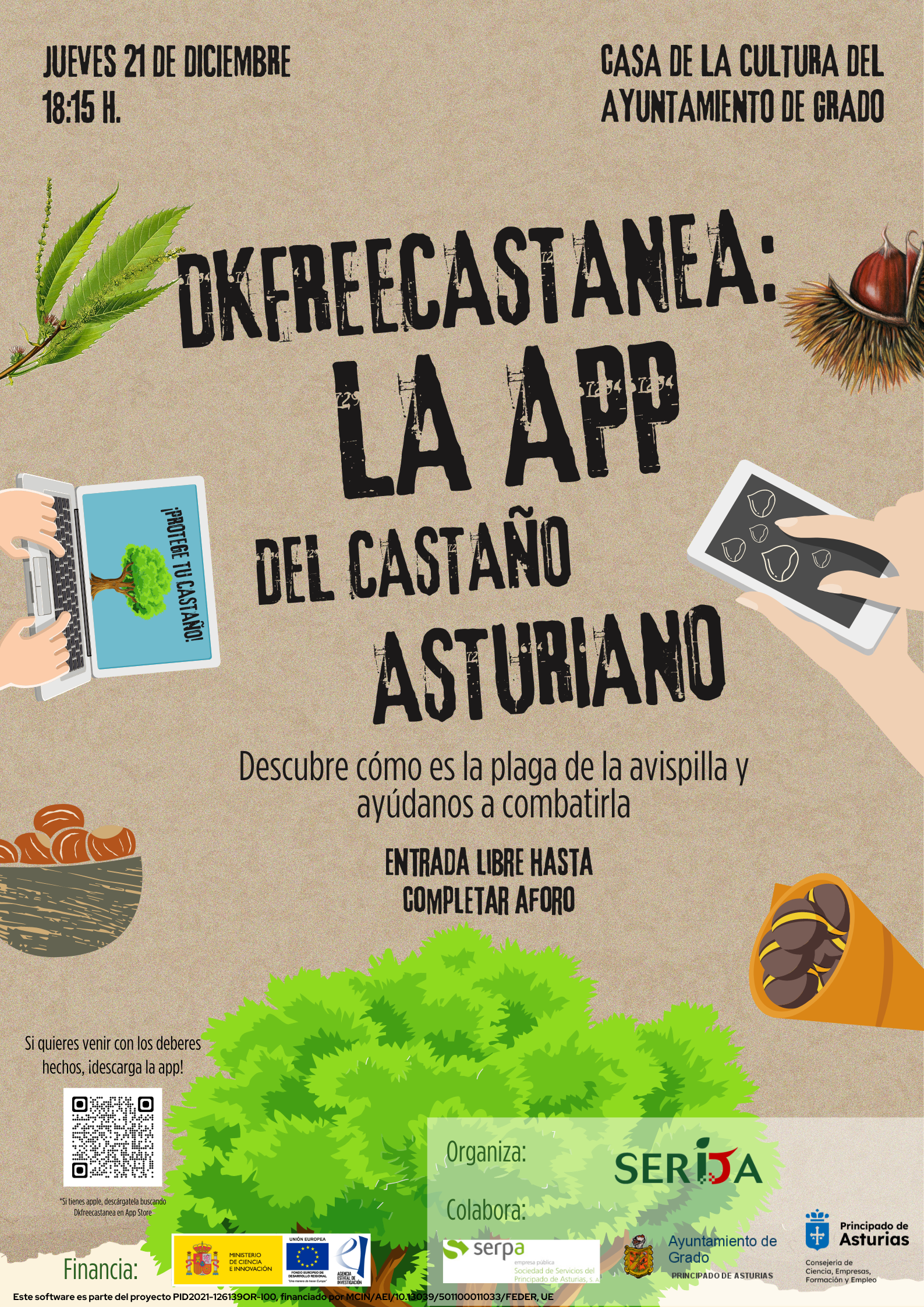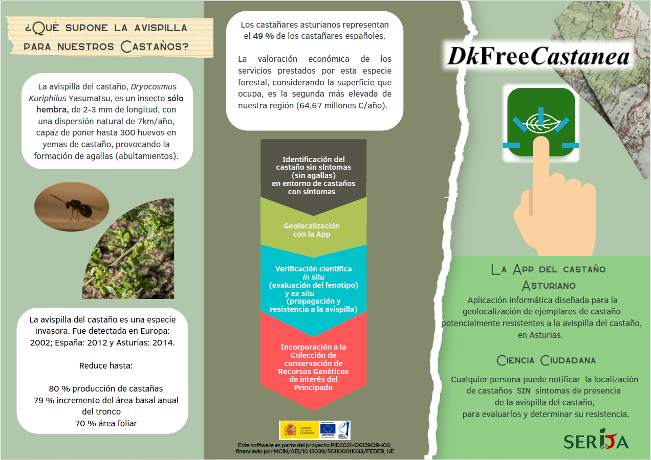 El Programa Forestal del SERIDA ofrece, el próximo 21 de diciembre, una pequeña demostración sobre la utilización de la aplicación recién creada DkFreeCastanea, un sistema pensado para proteger el castaño frente a la plaga de avispilla. Se hará a las 18.15 h. en la Casa de la Cultura de Grado, gracias a la colaboración del Ayuntamiento del municipio, con entrada libre hasta completar el aforo.