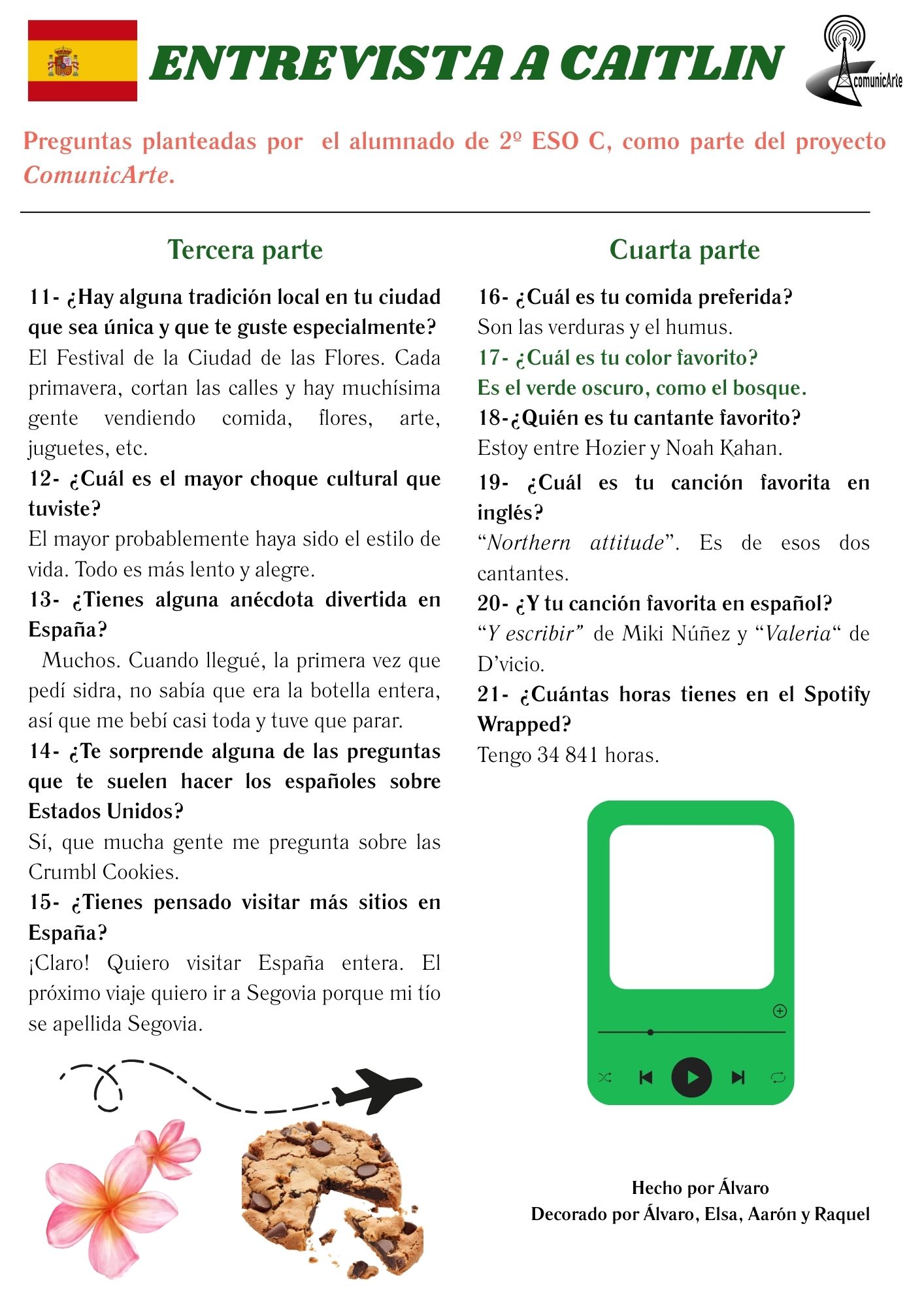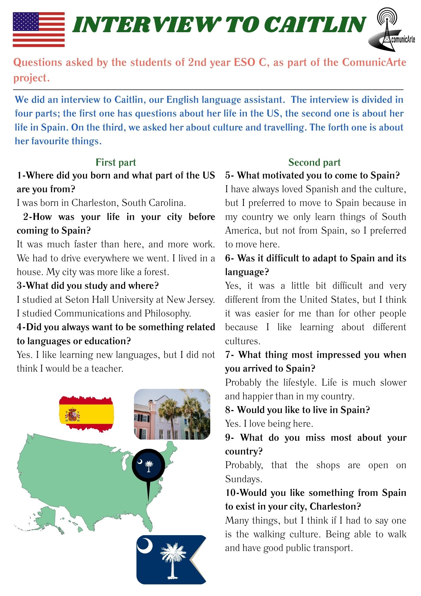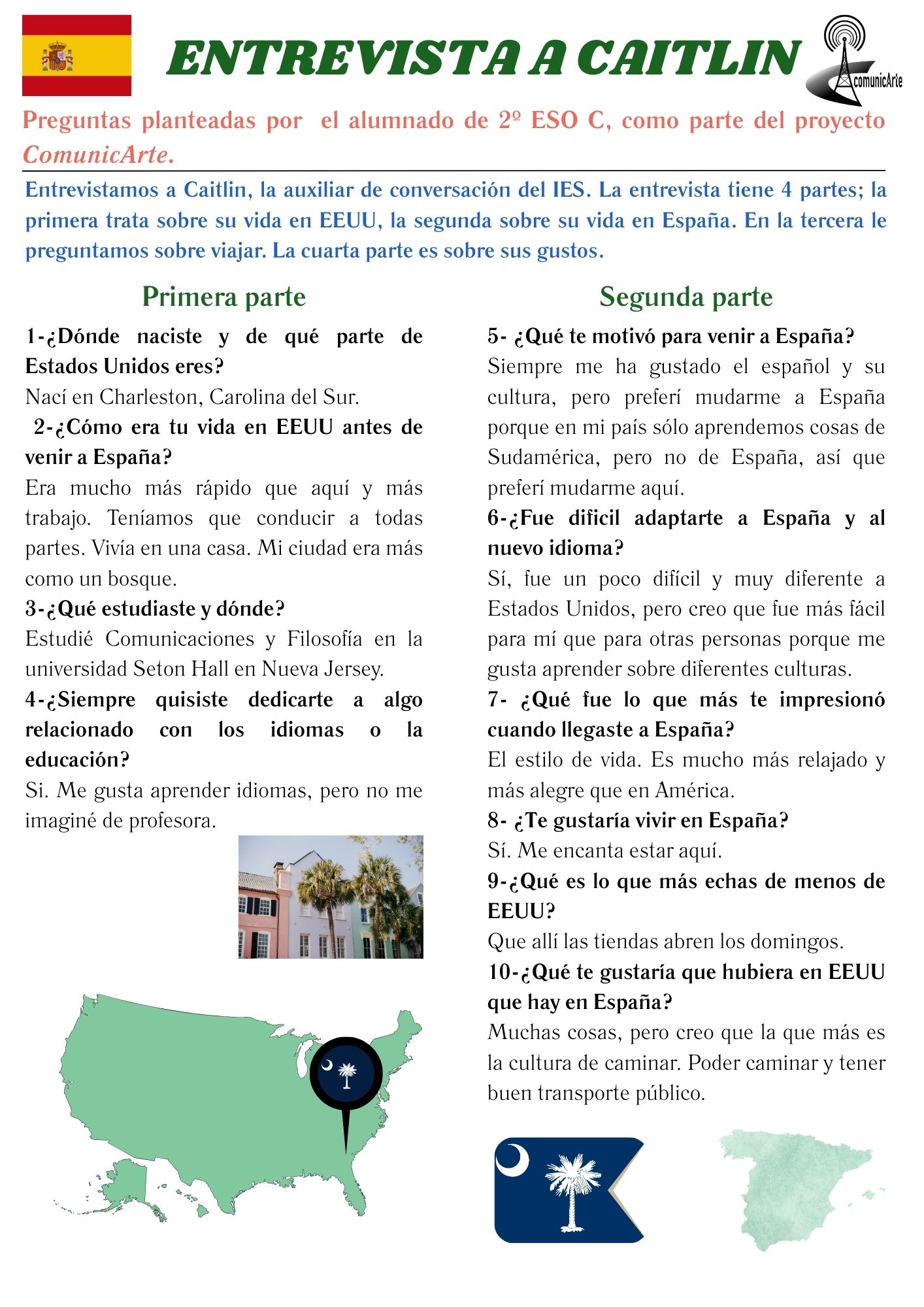 Os dejamos una entrevista muy especial. Una entrevista a nuestra auxiliar de conversación, Caitlin, realizada por nuestro alumnado de 2º ESO C. Caitlin es estadounidense, y tiene muchas cosas que contarnos.