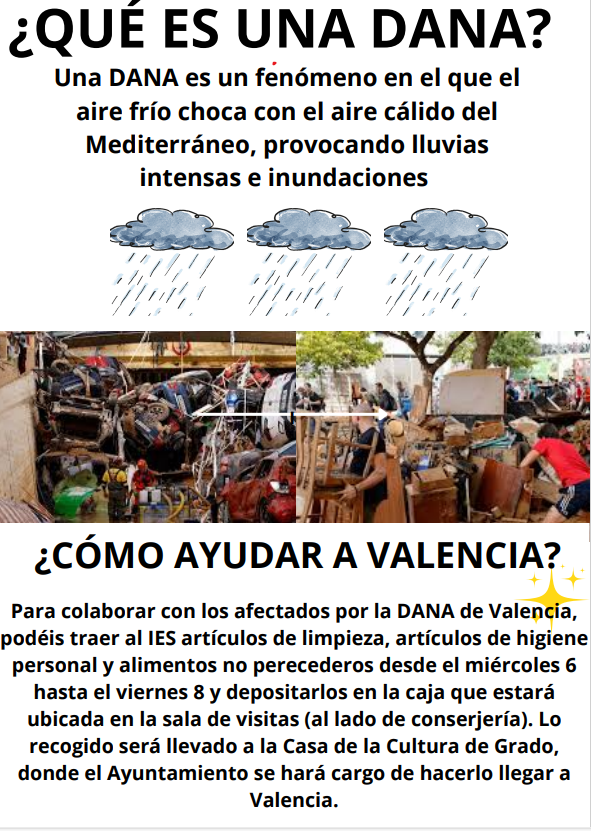 Desde la materia de Proyecto de Emprendimiento Social (3º ESO) se está organizando una recogida de alimentos y objetos a causa de la dana de Valencia.