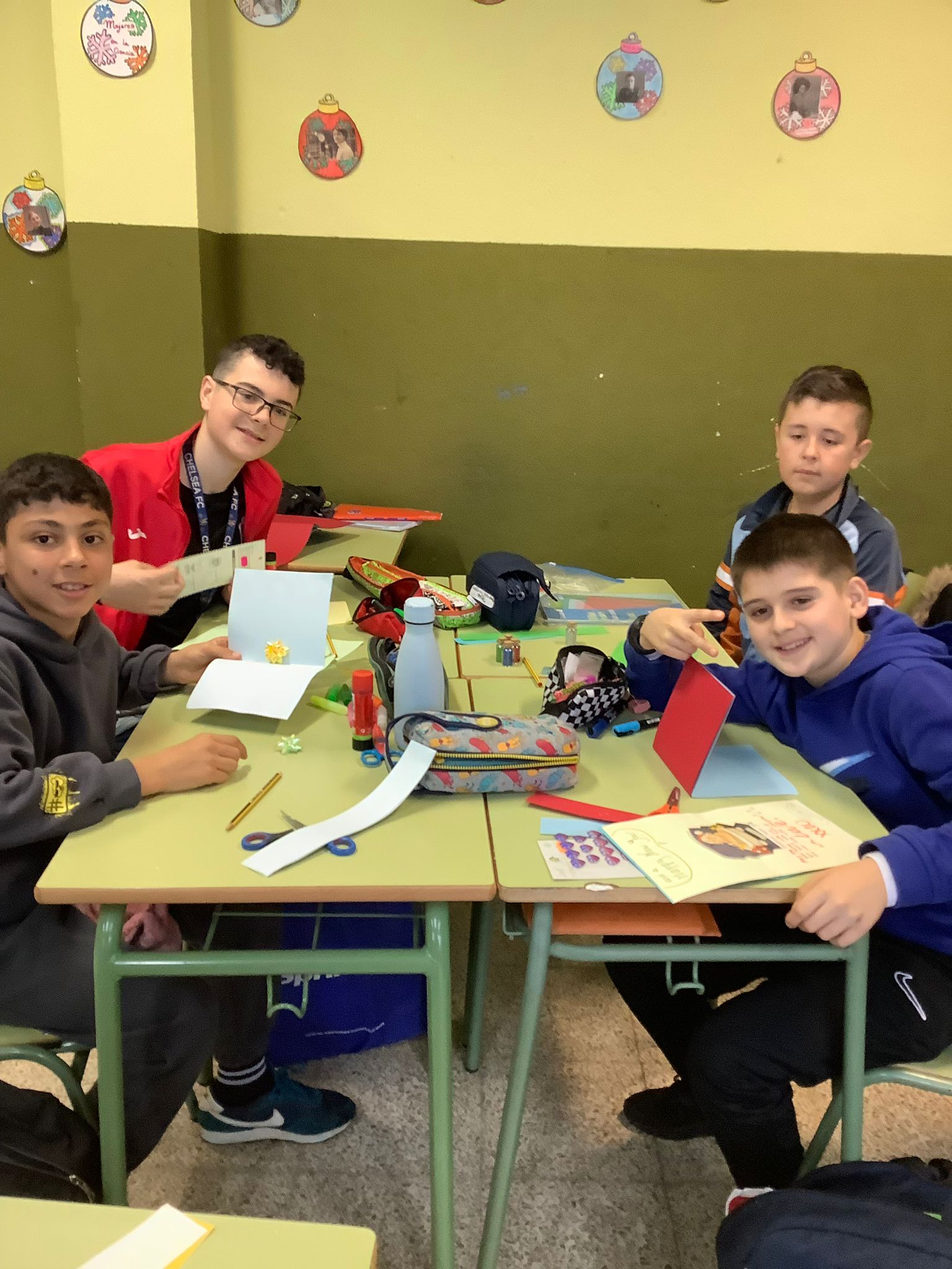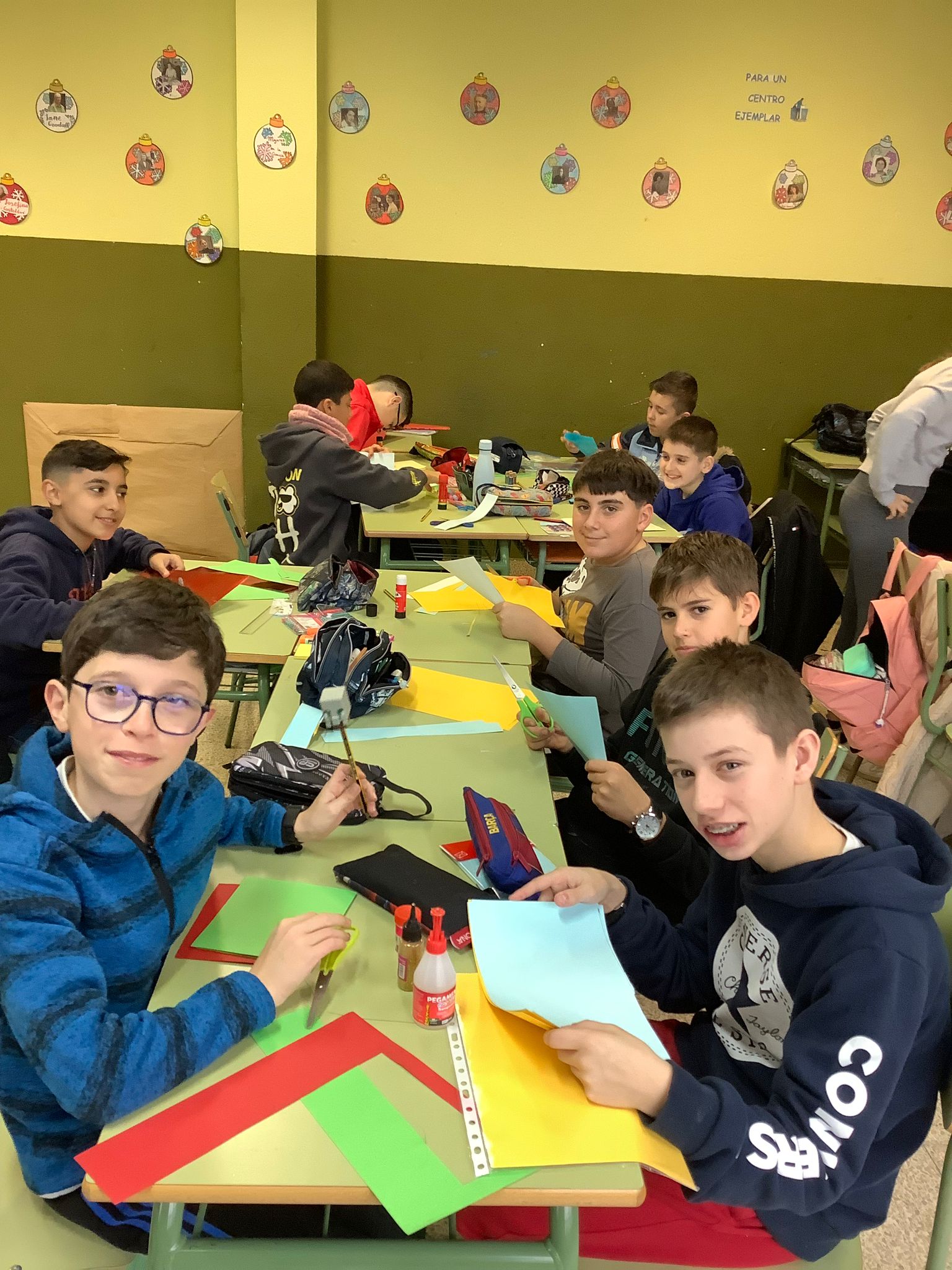 Desde el Departamento de Inglés se ha propuesto la siguiente actividad navideña para finalizar la primera evaluación de 1º ESO. Así, el alumnado tuvo que elegir entre decorar camisetas y hacer tarjetas de Navidad. Aquí tenéis el resultado. ¡Una clase ruidosa pero creativa!