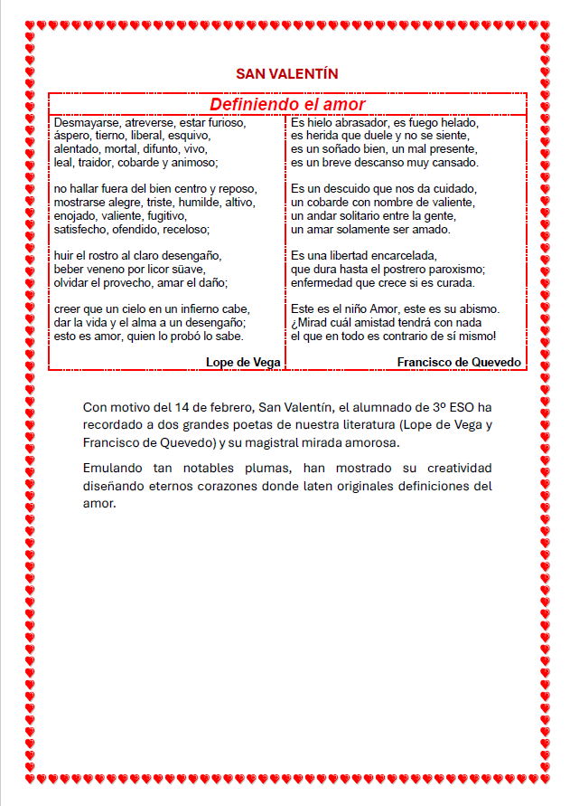 Con motivo del 14 de febrero, San Valentín, el alumnado de 3º ESO ha recordado a dos grandes poetas de nuestra literatura (Lope de Vega y Francisco de Quevedo) y su magistral mirada amorosa.